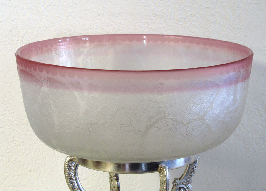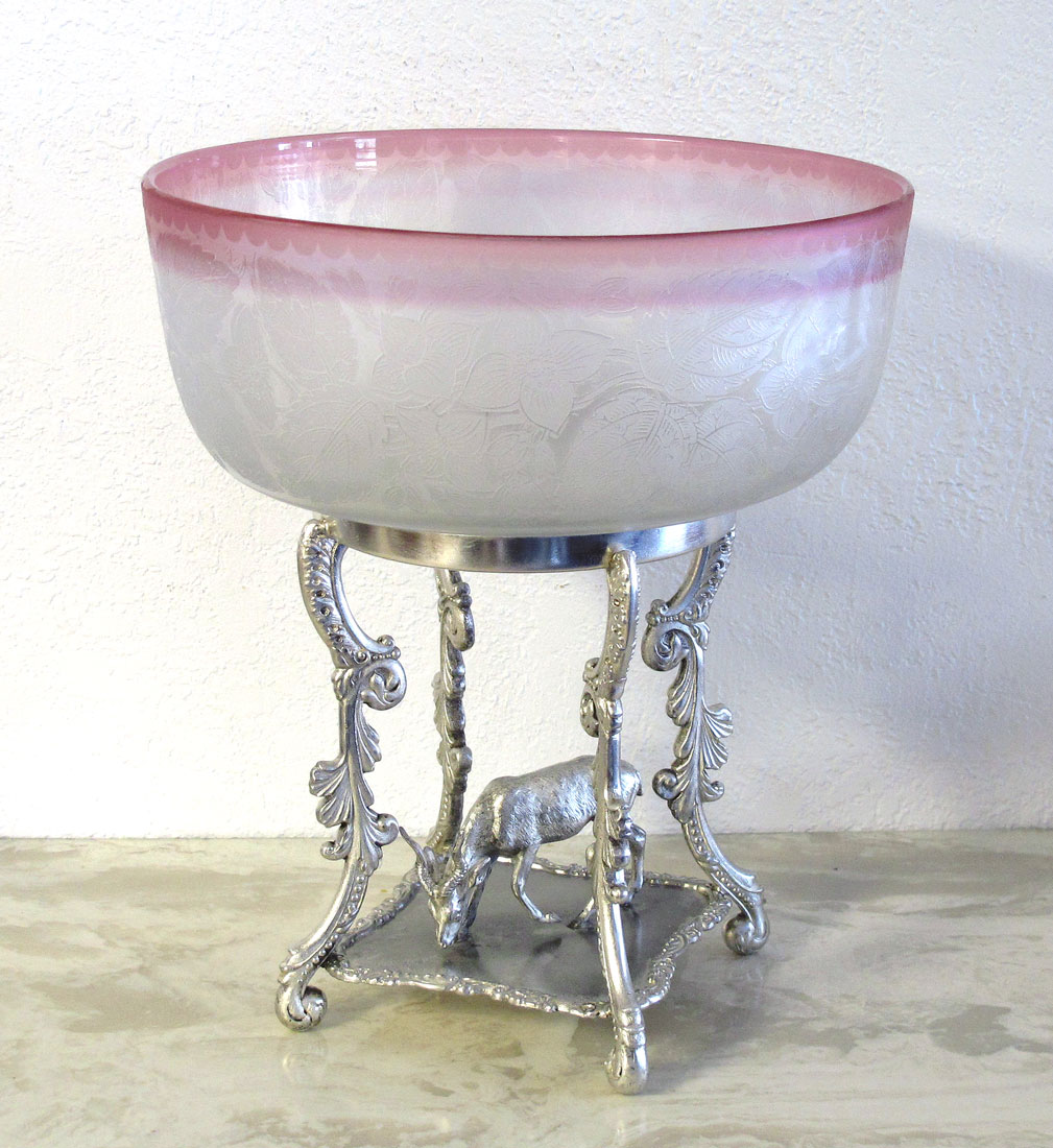 PAIRPOINT BRIDES BOWL ON STAND: Etched cranberry rim etched glass bowl rests in a figural stand centering a deer. The stand is signed Pairpoint, measures 6 1/2''. The bowl measures 8 3/4'' dia. Overall, 10 1/2'' tall.