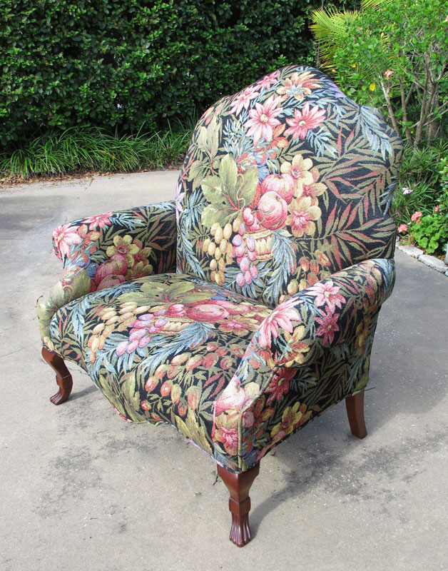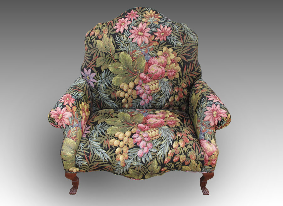 FLORAL WING BACK SETTEE CHAIR: Over large wingback chair with striking floral upholstery, on carved and shaped front legs. 50 1/2'' h. x 52 1/4'' x 35''.