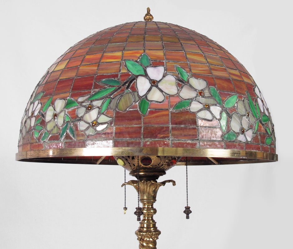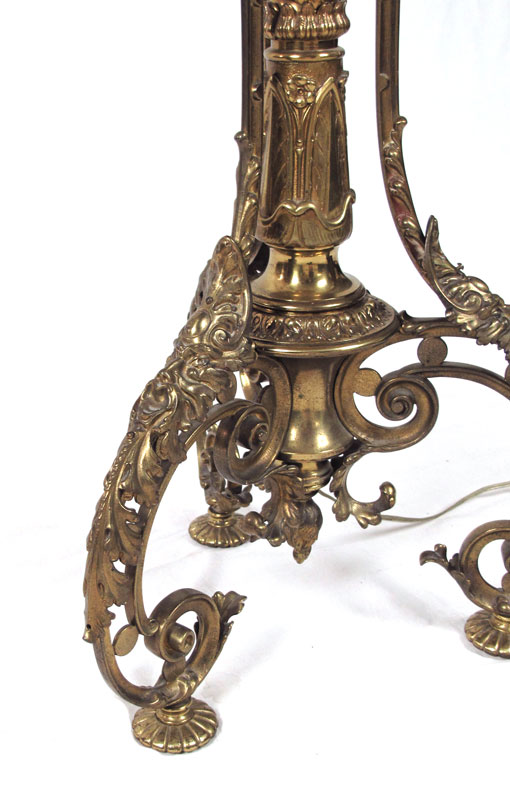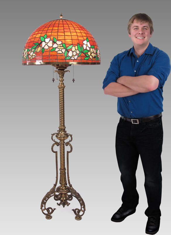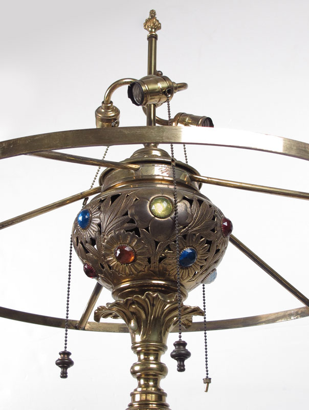 VICTORIAN ERA BRASS PIANO FLOOR LAMP WITH JEWEL TONE INSETS: The leaded glass was hand crafted in 1964, 70'' h., 25'' shade dia.