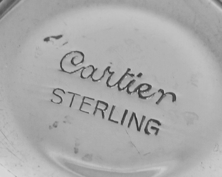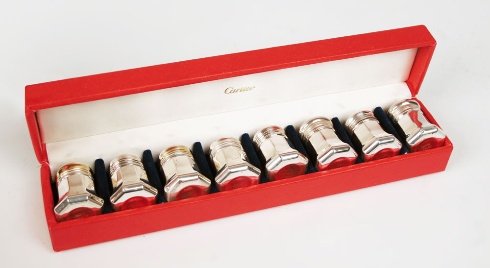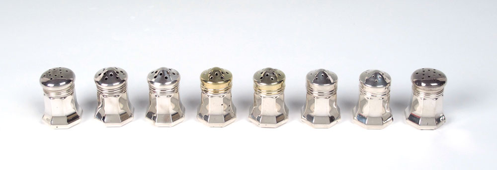 CARTIER STERLING SALT & PEPPER SHAKERS IN BOX: 8 salt and pepper shakers marked Cartier Sterling, 2 with vermeil tops, 2 tops differ from others. Sold in original Cartier box. Box measures 1 5/8'' x 9 1/2'' x 2''. Approx. 1.8 troy oz.