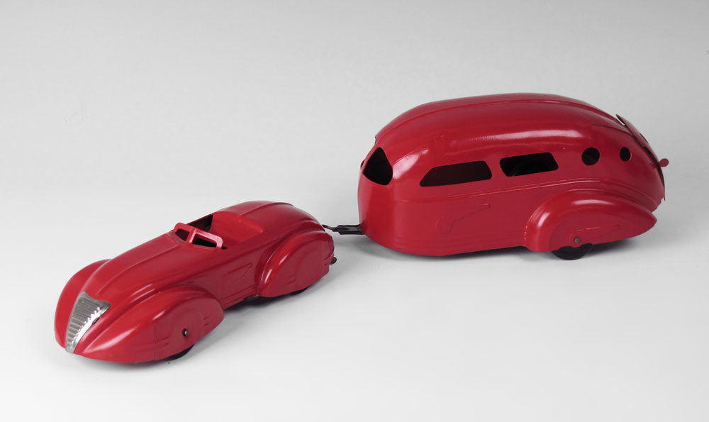 WYANDOTTE PRESSED STEEL 603 SPEEDSTER & TRAILER: To include the red Wyandotte 603 mechanical speedster with wooden wheels and RV trailer with wooden wheels. Speedster measures 2 3/4'' h. x 10 1/2'' x 3 3/4'', trailer 4 1/2'' h. x 11 1/2'' x 5 3/8''.