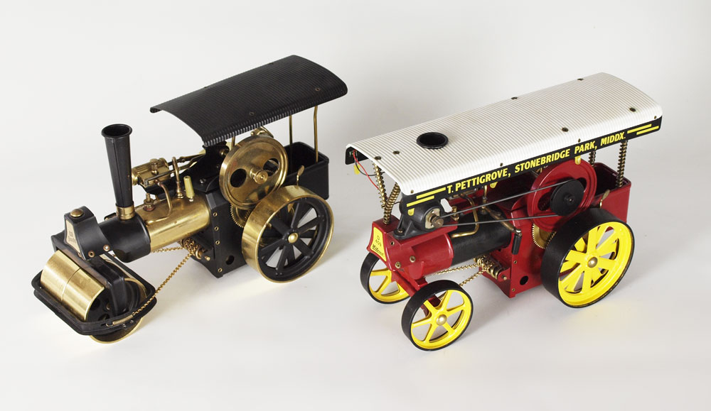 WILESCO STEAM ENGINES CIRCA 1950'S: To include 1) T. Pettigrove Traction engine D409, 7 3/4'' h. x 12'' x 6''. 2) Old Smoky Steam Roller, black and brass, 7 7/8'' h. x 13'' x 5 1/2''. No boxes.