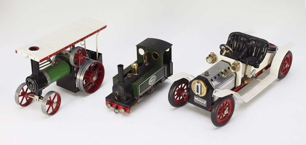 COLLECTION OF 3 MAMOD STEAM ENGINES: To include 1) Locomotive SL1, 5 1/4'' h. x 8 3/4'' x 3 7/8''. 2) Steam Tractor, 7'' h. x 11'' x 5 1/4''. 3) Roadster, 5 3/8'' x 15 3/4'' x 6 1/4''.