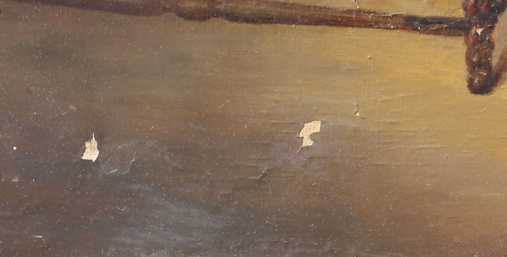 CONDITION: Several areas of inpaint, some paint fleck, needs cleaning.