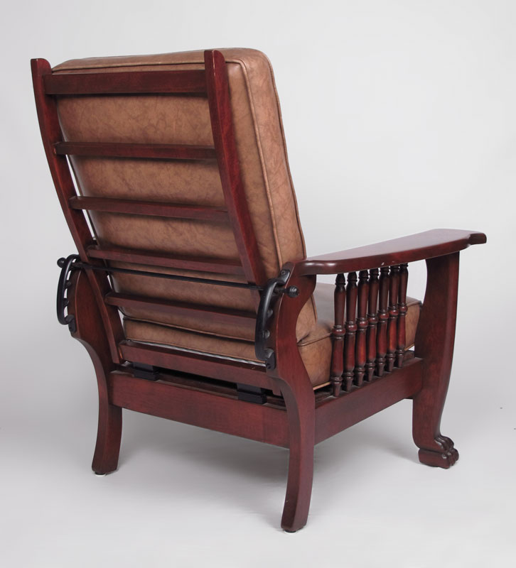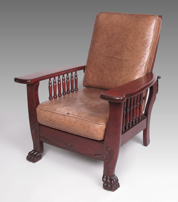 MORRIS TYPE RECLINING CHAIR: Carved front skit and front arm supports, ending in paw feet. Mottled brown leather cushions. 39 1/4'' h. x 32 1/4'' x 33''.