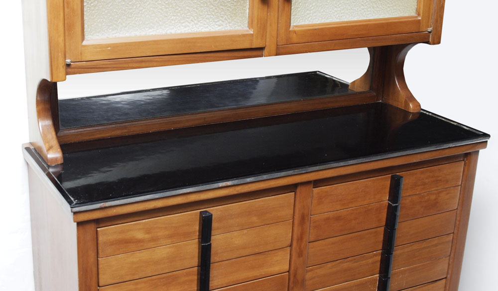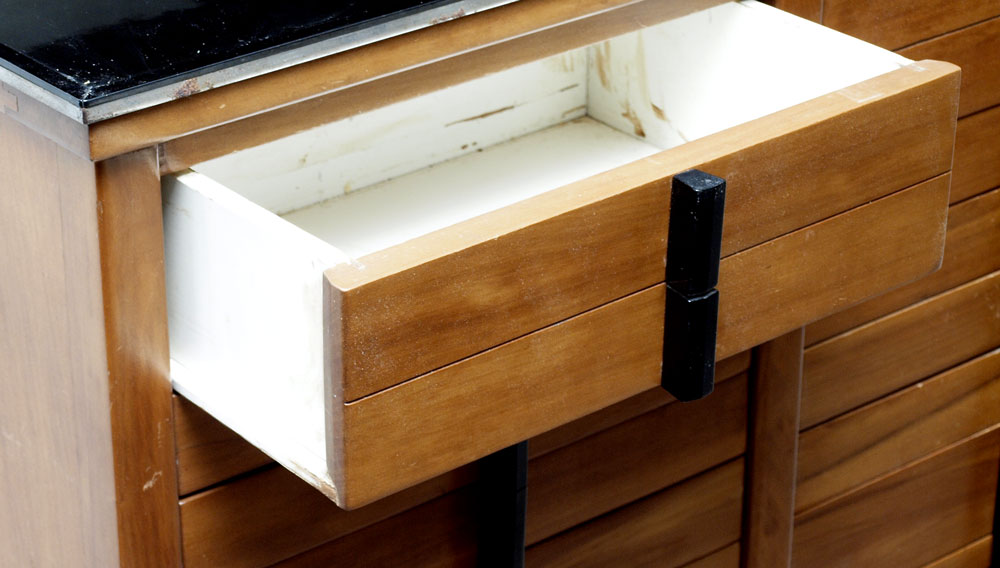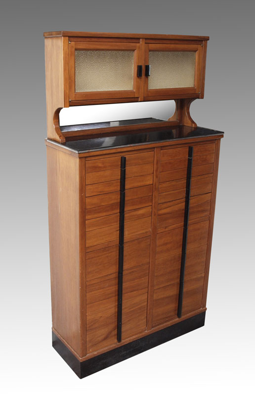 WEBER MODEL C DENTAL CABINET: 2 glass doors over mirrored back and black glass shelf over 18 drawers of assorted depths. Metal tag on back reads ''Weber Model C Serial No. 3168''. Measures 61'' x 31 3/8'' x 12''.