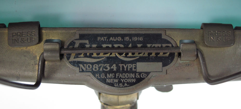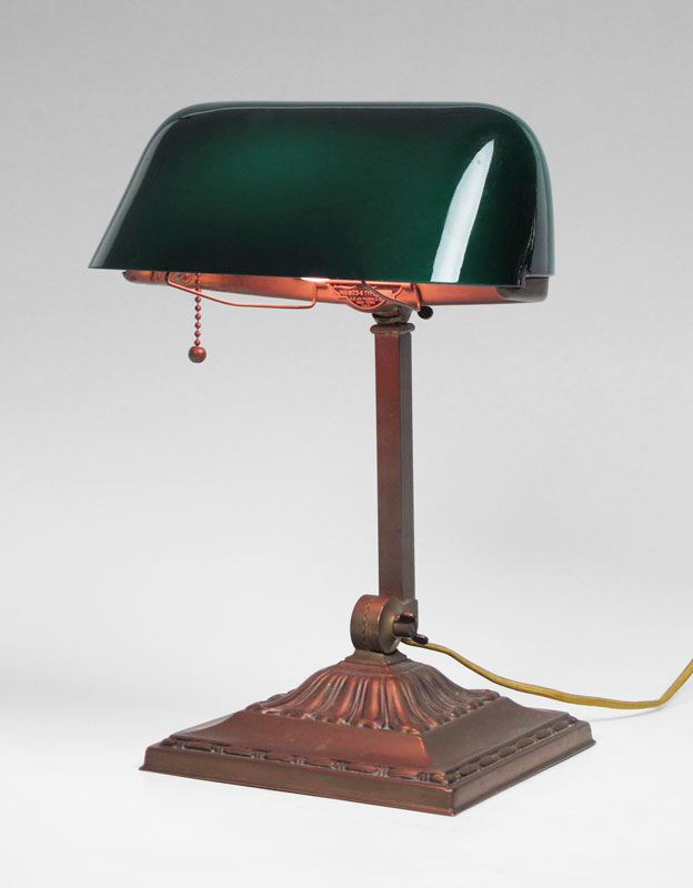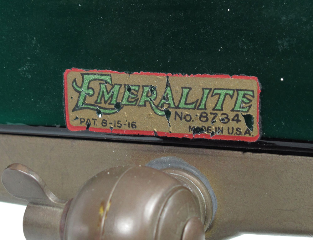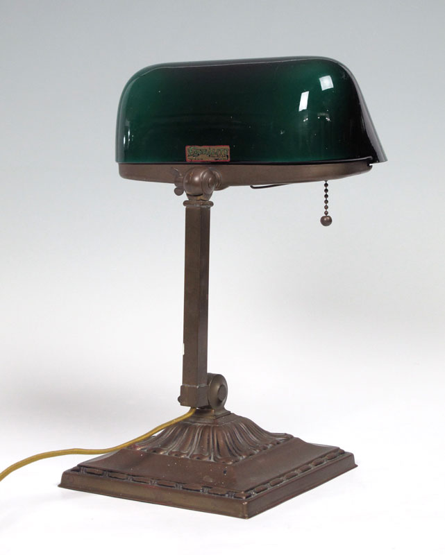GREEN SHADE EMERALITE 8734 DESK LAMP: Emeralite No. 8734 desk lamp by H. G. McFadden with green glass shade, adjustable arm and embossed square base. Overall 13 1/8'' h. x 8 1/2'' x 8 1/2''.