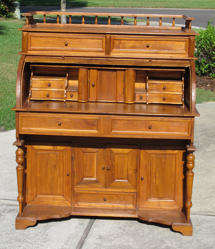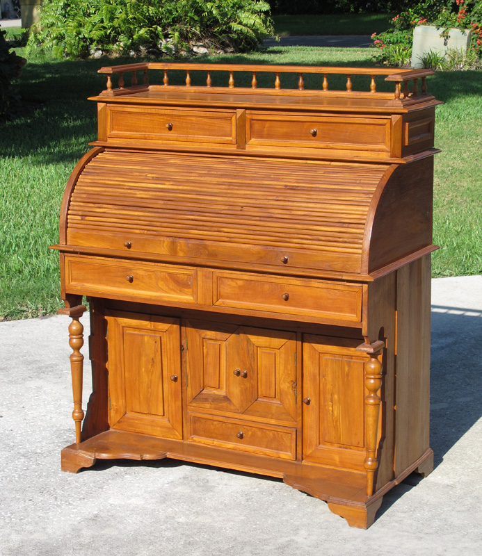 CHESTNUT ROLL TOP DESK: Top gallery over 2 half drawers. Roll top front opens to reveal drawers, door and pigeon holes. Base with 2 half drawers over 4 doors and small drawer. 49'' h. x 41 1/4'' x 21''.