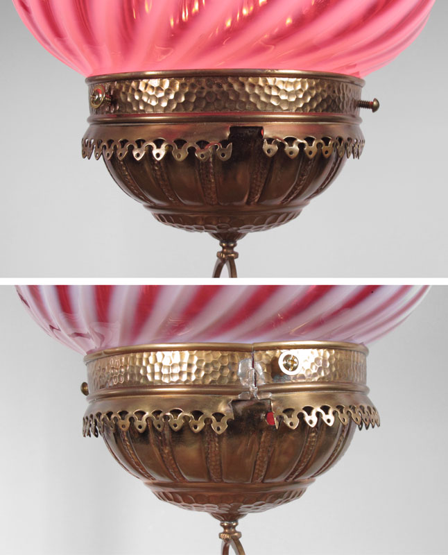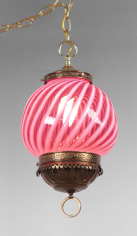 CRANBERRY SWIRL OPALESCENT HANGING LAMP: 18'' h. x 9'' excluding chain.