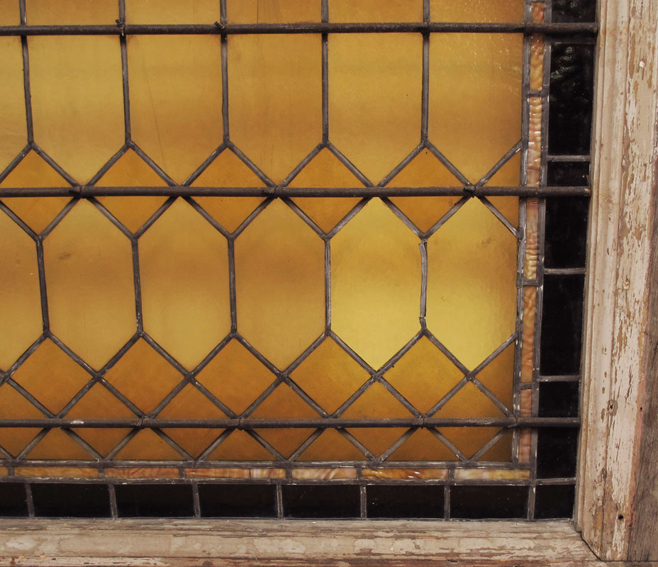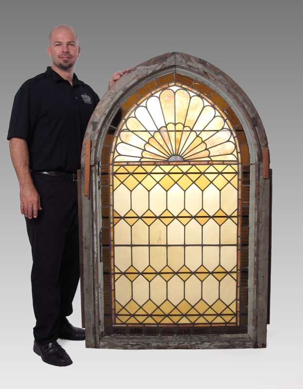 VINTAGE ARCHED STAIN GLASS WINDOW: Fan shape top with panels of caramel slag, purple slag, hues of golds and yellows, root beer border. Original wood frame. 64 1/4'' h. x 42 3/4'' x 3 1/2''.