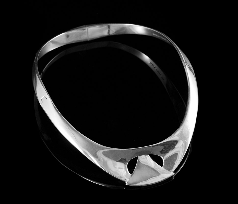 TAXCO STERLING COLLAR NECKLACE: Abstract form, pressure clasp back, hinged sides, marked Mexico Taxco 925. Interior dimensions 5 1/8'' x 4 3/8''. Approx. 3.5 troy oz. Sold with presentation box, 1 1/4'' x 6'' square.