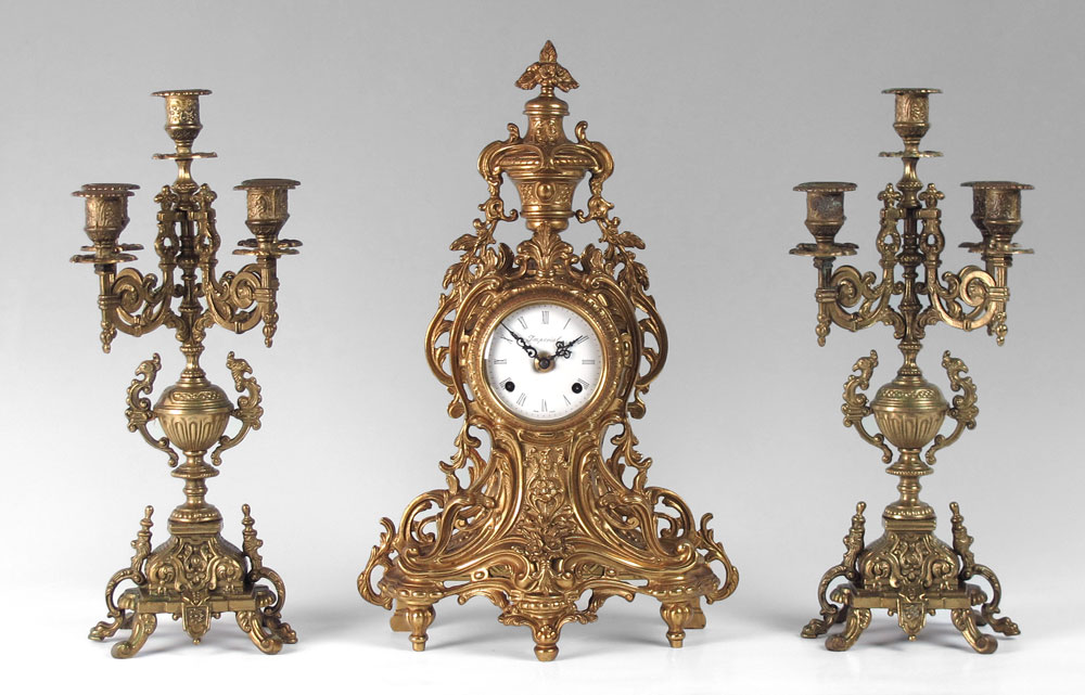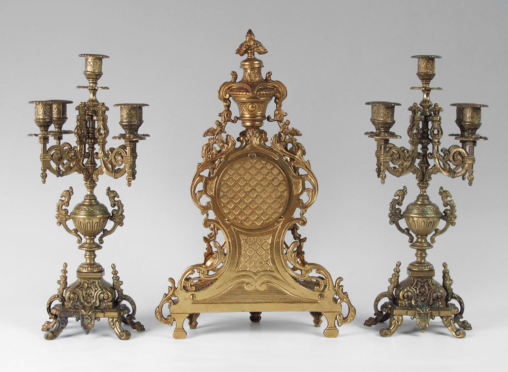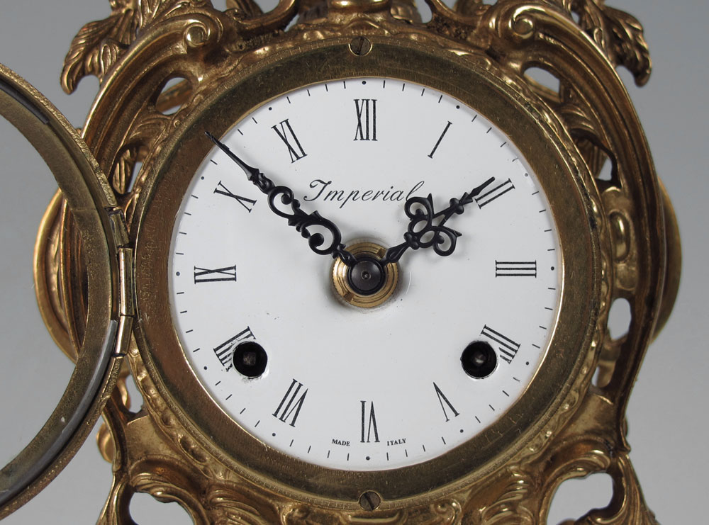 IMPERIAL BRASS CLOCK GARNITURE SET: Highly decorative cast brass case featuring floral and foliate motifs, porcelain face with Roman numerals marked ''Imperial, Made Italy''. German key wind time and strike movement. 18 1/2'' h. x 11 3/4'' x 5''. Sold with 5 light candelabra garniture set, 16 3/4'' x 8 1/2'' dia.