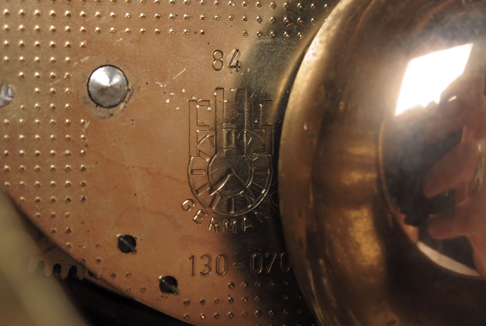 CONDITION: Note missing latch to front bezel, arms on one candelabra loose, wear to finish, currently not running.