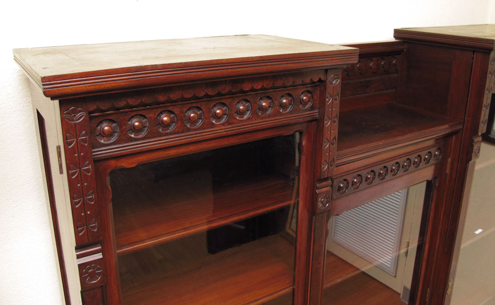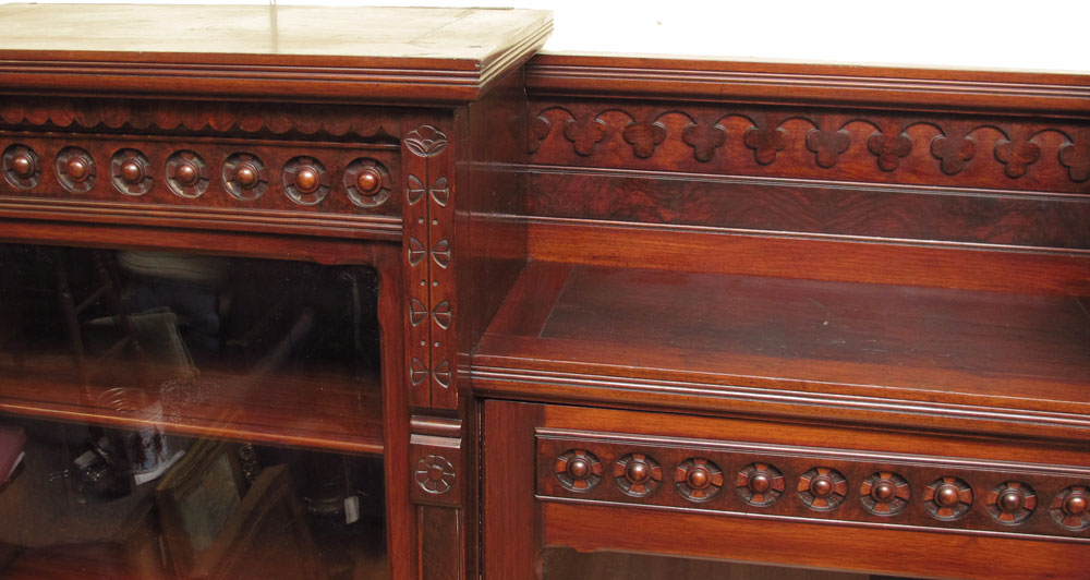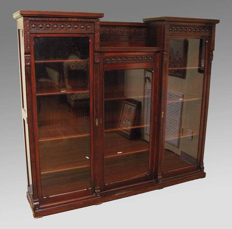 VICTORIAN ERA TRIPLE FRONT MAHOGANY BOOKCASE: Center section surmounted by 2 higher sections with carved framed glass fronts, adjustable shelves. 64 1/2'' h. x 72'' x 15''.