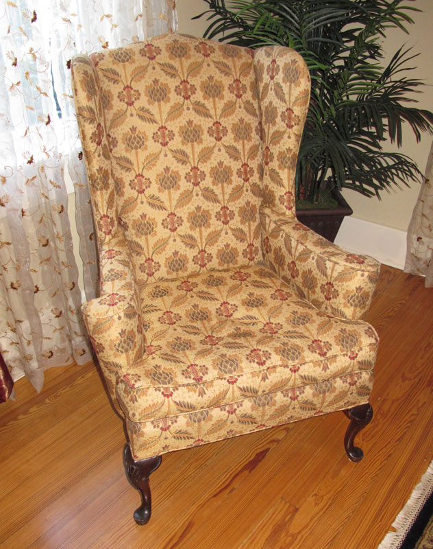 FLORAL WING BACK CHAIR: Floral upholstery, carved and shaped legs ending in pad feet. 45 3/4'' h. x 32 3/4'' x 34''.