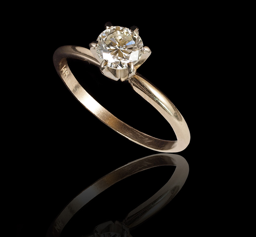 14K TIFFANY STYLED DIAMOND SOLITAIRE ENGAGEMENT RING: 14K yellow gold 6 prong ring with one round brilliant cut diamond. Weight: .50 Ct. Approx. Rated VS1 in clarity and M in color. The diamond is prong set. Weight: 1.9 grams Size: 6.5