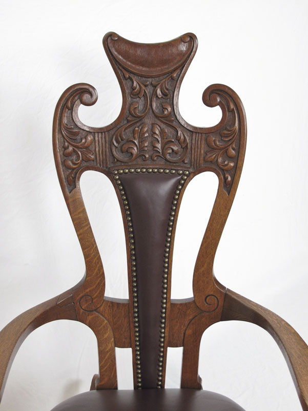 LATE VICTORIAN GOLDEN OAK CARVED ROCKER: Richly carved crest, newer leather upholstery, measures 45'' h. x 24'' x 35 1/2''.