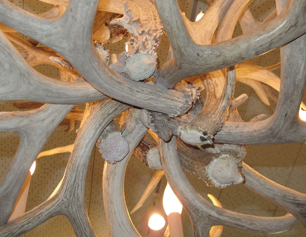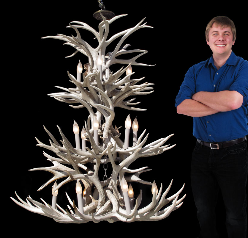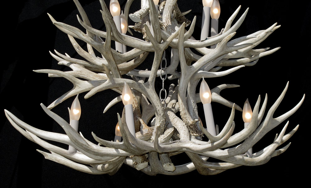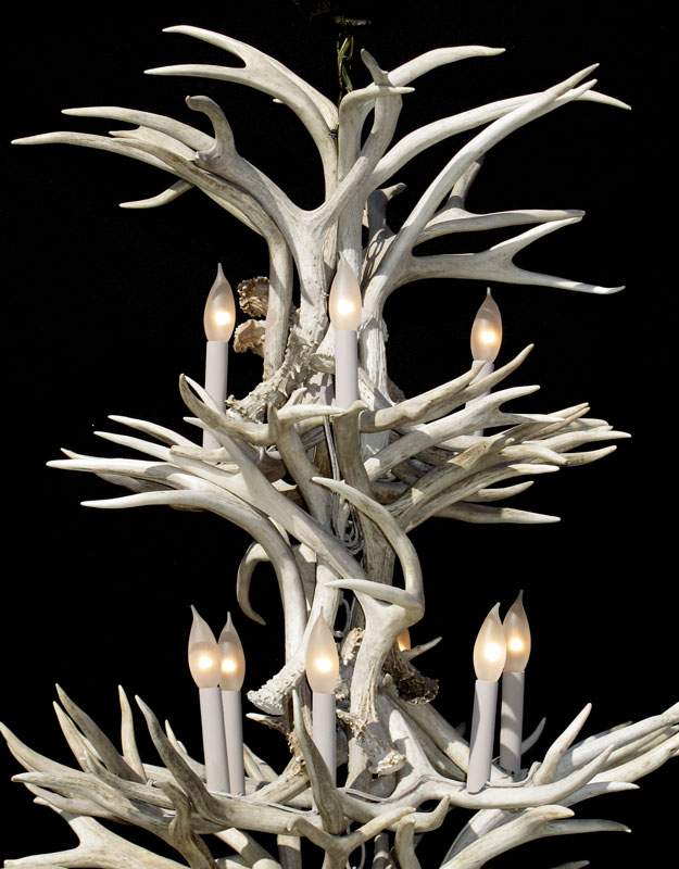CASCADING MULE DEER ANTLER CHANDELIER: 3 level, 16 light, 44'' h. x 37'' dia.