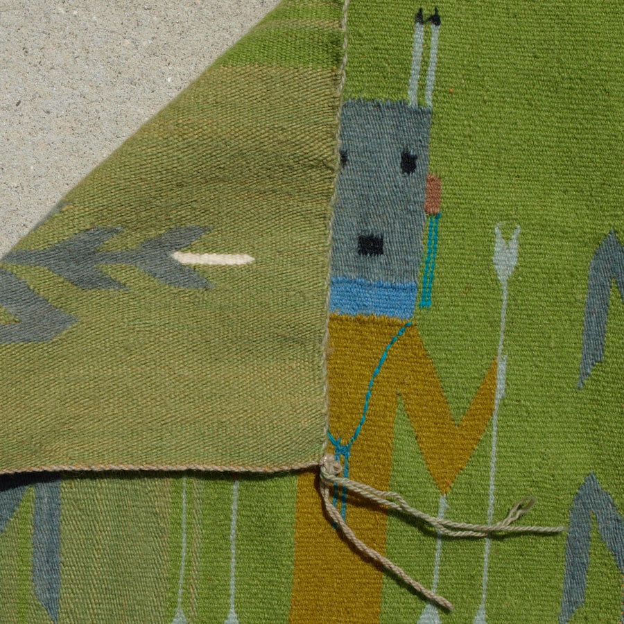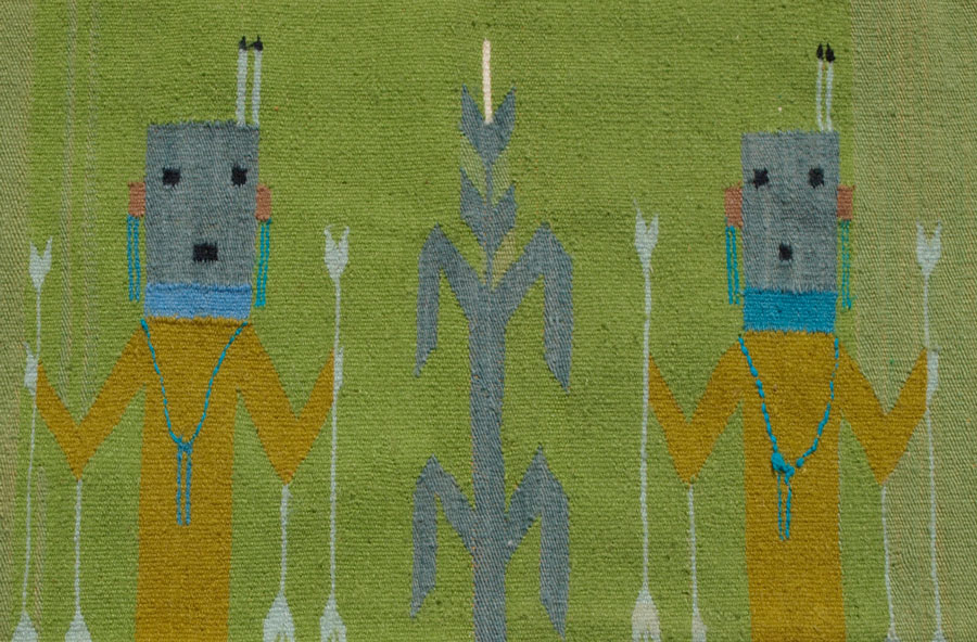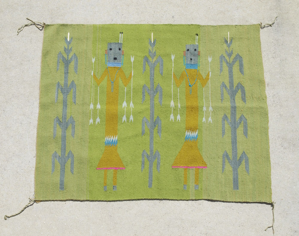 MODERN NAVAJO HAND WOVEN SMALL RUG, 31'' x 37'': This rug is another example of a Yei or corn dancers Navajo rug. The colors are atypical but still pleasing. The green field has some color change in it that is not detrimental to the look of the rug. The three stalks of blue corn have the two mustard colored dancers with blue masked heads between them. This would make a great wall hanging. Condition is good.