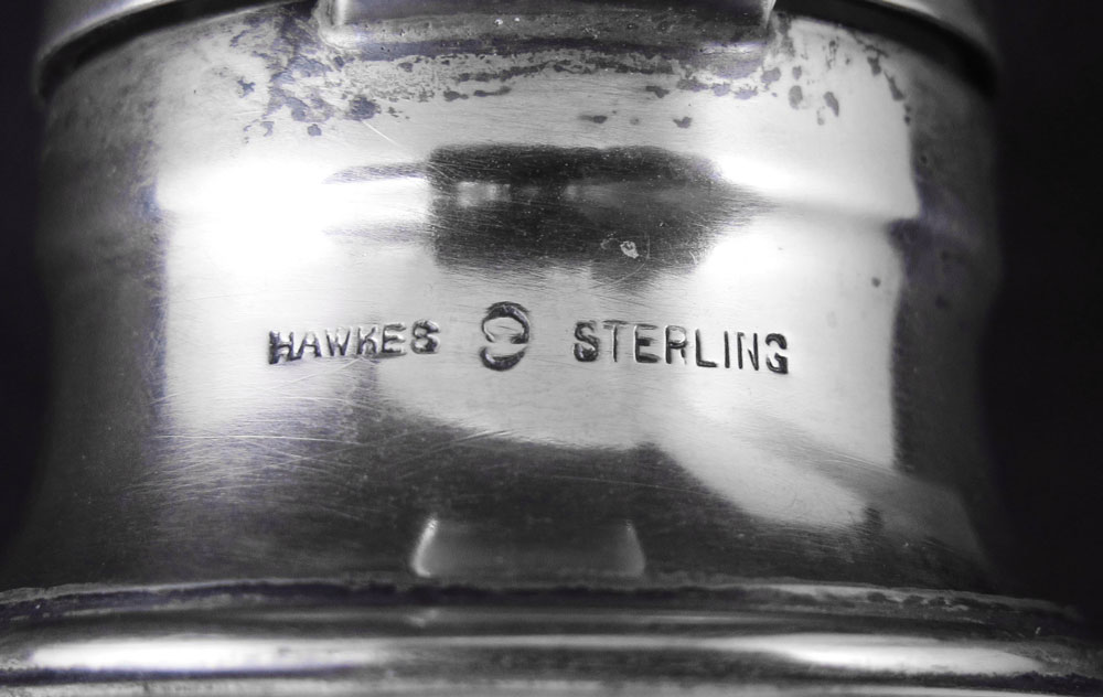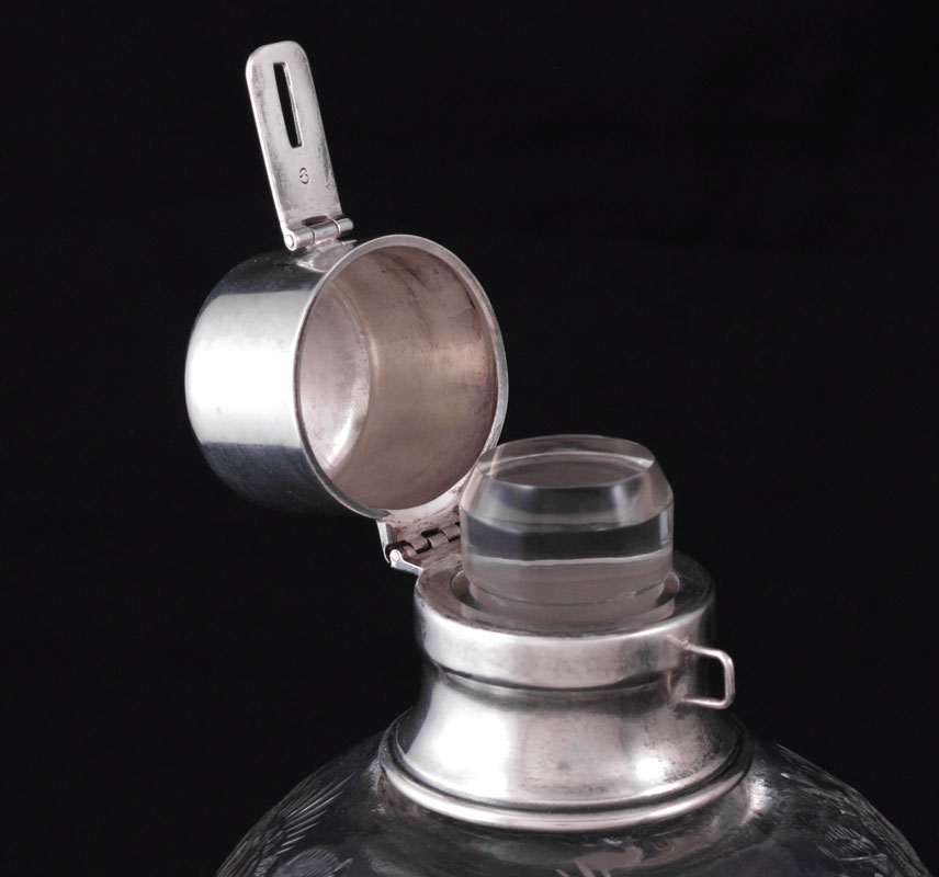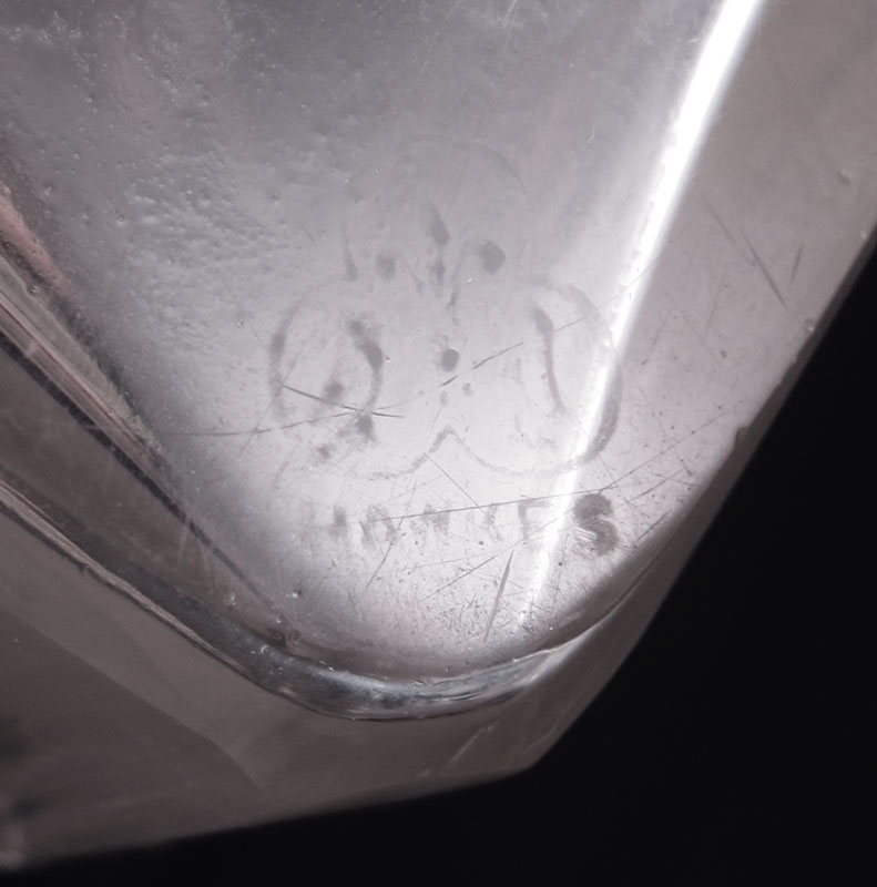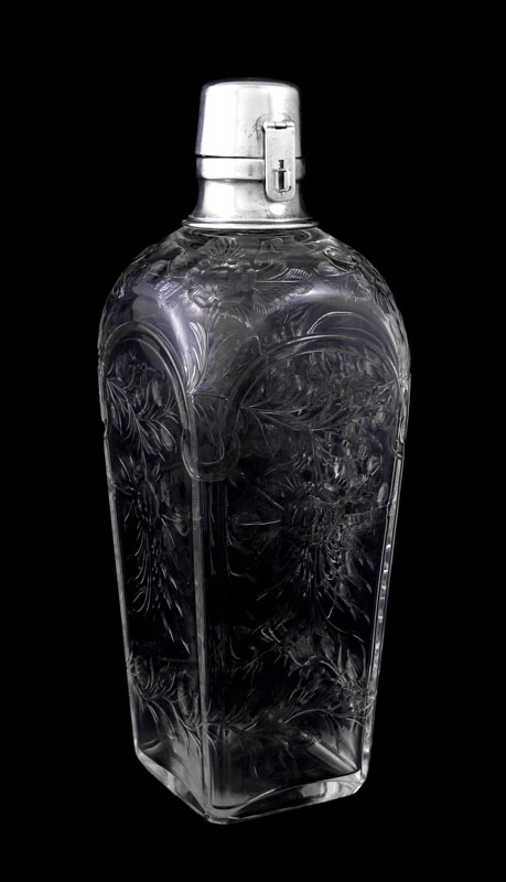 SIGNED HAWKES CUT GLASS STERLING MOUNTED DECANTER: Intaglio cut floral motif, signed on base and marked Hawkes Sterling on collar. Measures 9 5/8'' h. x 3 1/4'' square.