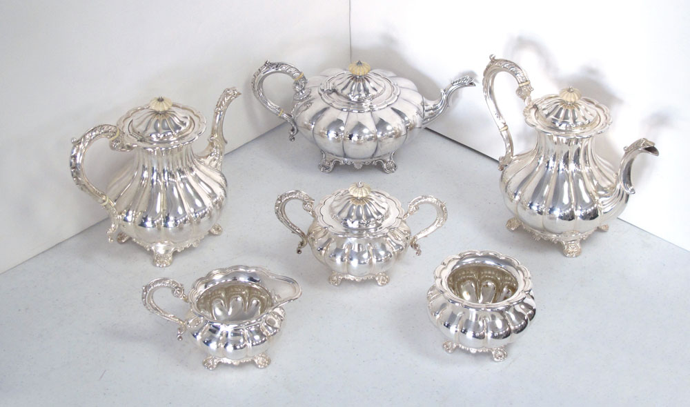 BARKER BROTHERS ENGLISH SILVER PLATE 6 PIECE TEA SERVICE: To include 1) 2 coffee pots with hinged lids, bone finials and heat shields, 8 3/8'' h. x 10''. 2) Teapot with hinged lid, bone finial and heat shields, 6'' h. x 12 1/4''. 3) Covered sugar with bone finial, 5'' h. x 8 1/4''. 4) Open creamer, 4'' h. x 6 7/8''. 5) Open waste bowl, 3 1/2'' h. x 5''.