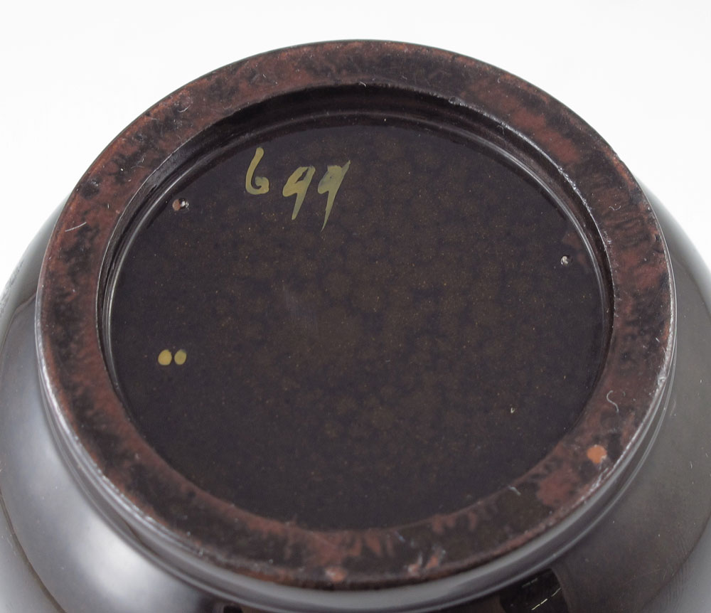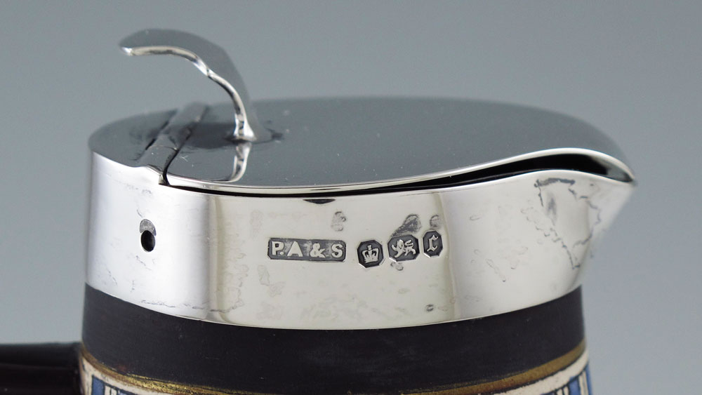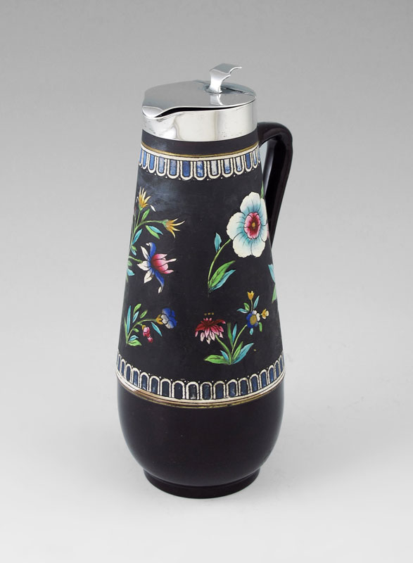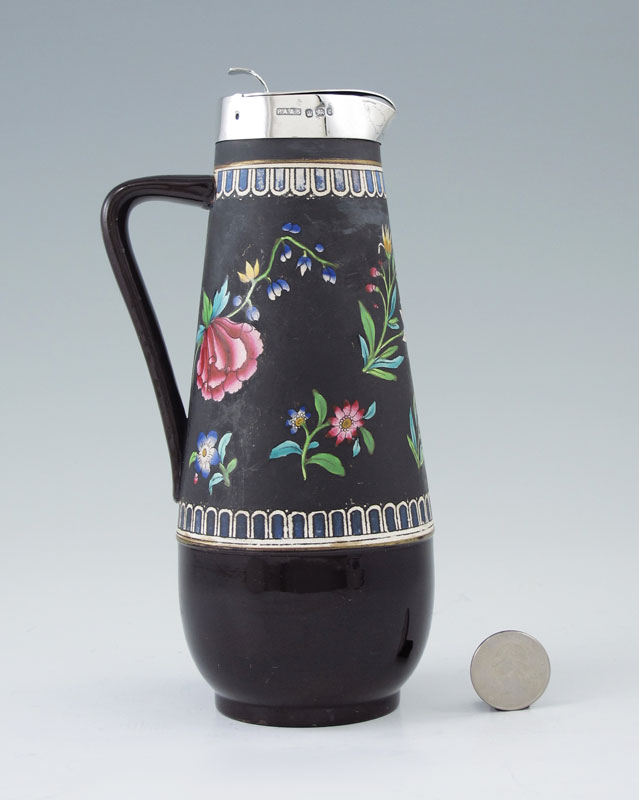 P. ASHBERRY & SONS STERLING RIM SYRUP JUG: 1909 Sheffield hallmark hinged lid. Tin glazed floral decoration with brown glaze base. Marked simply 699 on base. Measures 8 1/2'' h. x 3 3/4''.