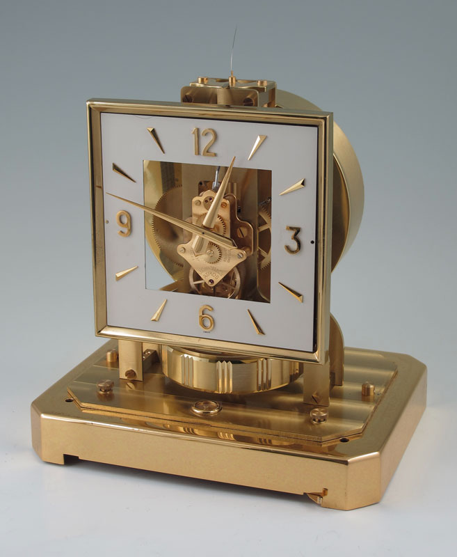1962 LECOULTRE ATMOS CLOCK: Serial number 148621 dates to 1962, Brass frame case with glass on all sides. Marked Le Coultre & Cie Atmos on front of movement. Measures 9 1/4'' h. x 8 1/4'' x 6 1/4''.