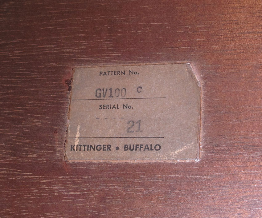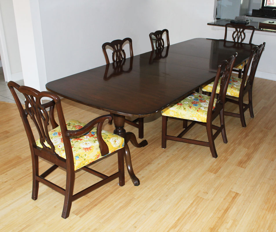 KITTINGER CHIPPENDALE STYLE MAHOGANY DINING TABLE, 3 LEAVES AND 6 CHAIRS: Double pedestal table, paper label ''Kittinger Buffalo, GV100 C, Series 21''. Table measures 29 3/4'' h. x 68 1/2'' x 45'', leaves 18 1/4''. The set of 6 chairs are not known to be Kittinger. Arm chair 38 1/4'' h. x 24 5/8'' x 23''.