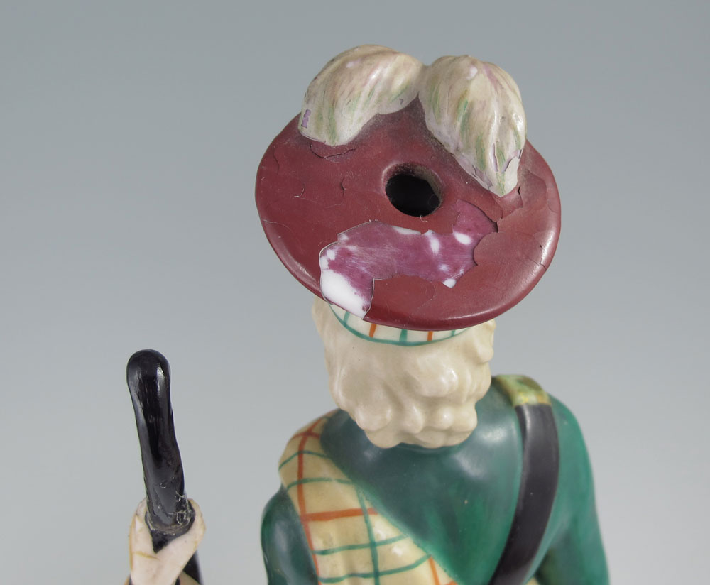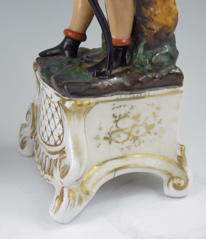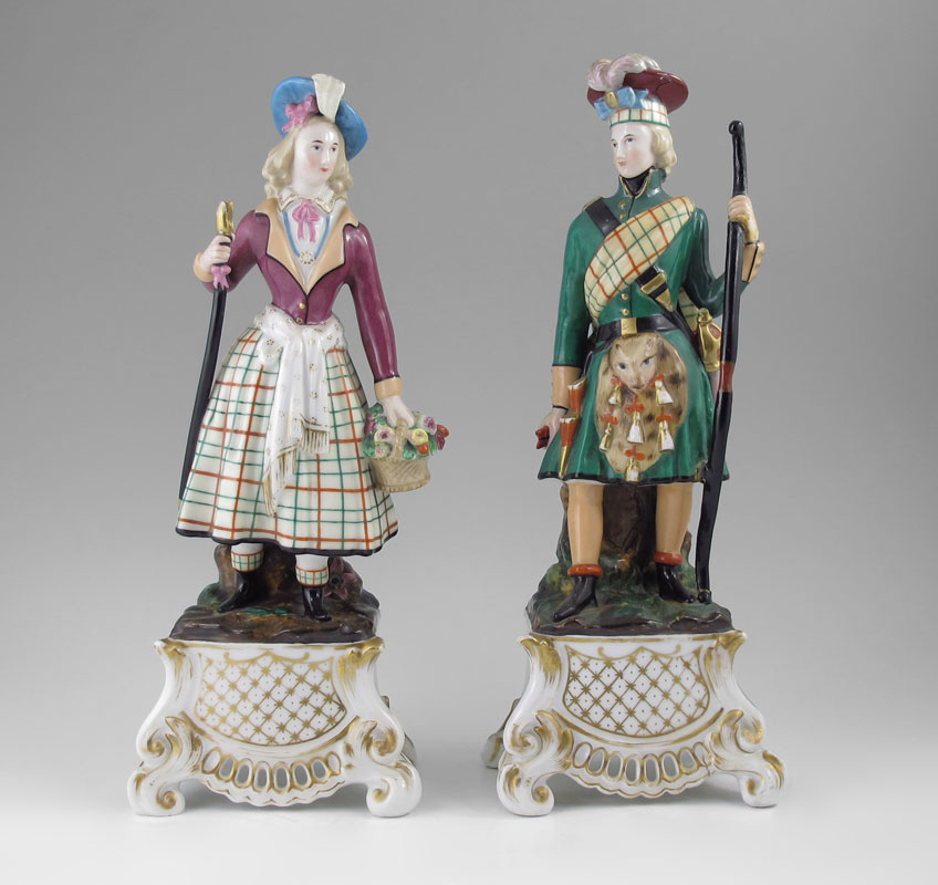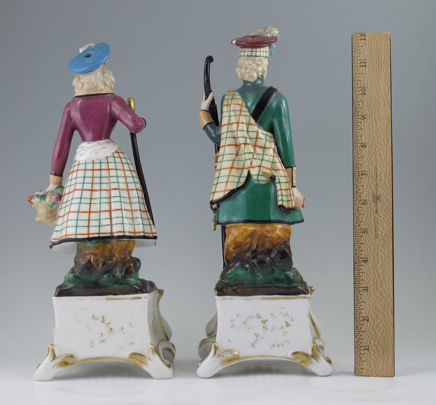EARLY SITZENDORF FIGURES MODELED AS SCOTTISH MAN & WOMAN: To include 1) Man with longbow, attired in traditional Scottish attire. 12 3/4'' h. x 5'' x 3 7/8''. 2) Woman holding basket of flowers and walking stick, traditional Scottish attire. 12 1/8'' h. x 5'' x 3 7/8''.