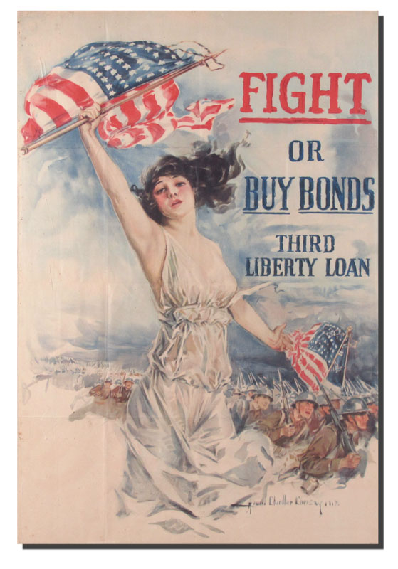 CHRISTY, Howard Chandler, (American 1873-1952): WWI era Third Liberty Loan poster. Scene of Christy Girl with American flags and soldiers, reads ''FIGHT OR BUY BONDS THIRD LIBERTY LOAN''. 30'' x 20''.