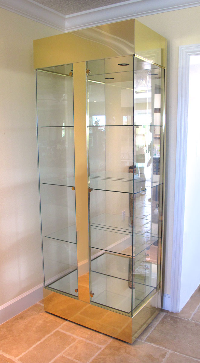 BRASS AND GLASS LIGHTED DISPLAY CASE: Illuminated interior, mirrored back, 3 glass shelves. 82 1/2'' h. x 32'' x 19 1/4''. Please see matching cases next two lots.