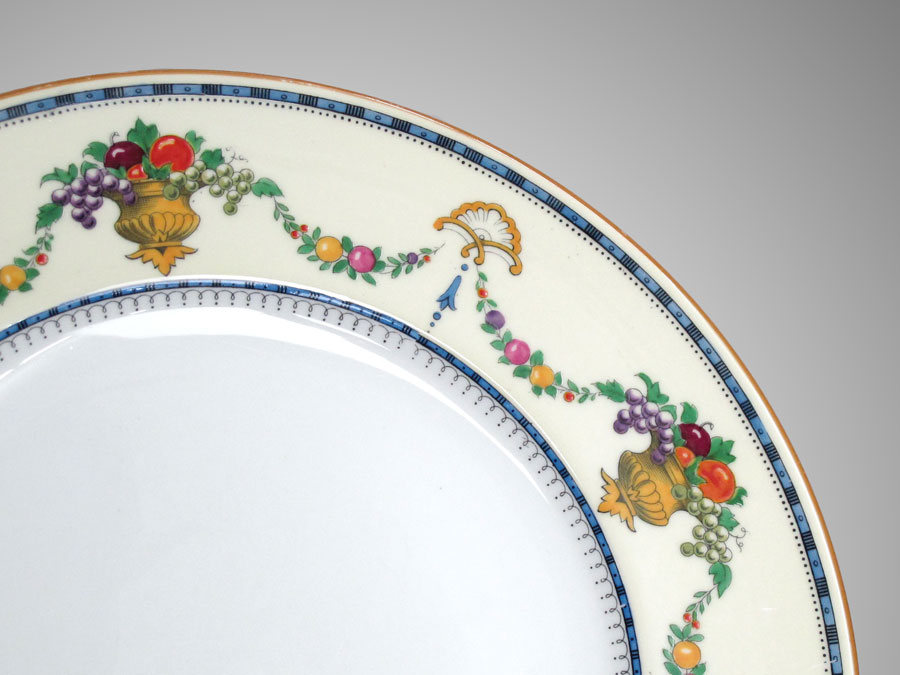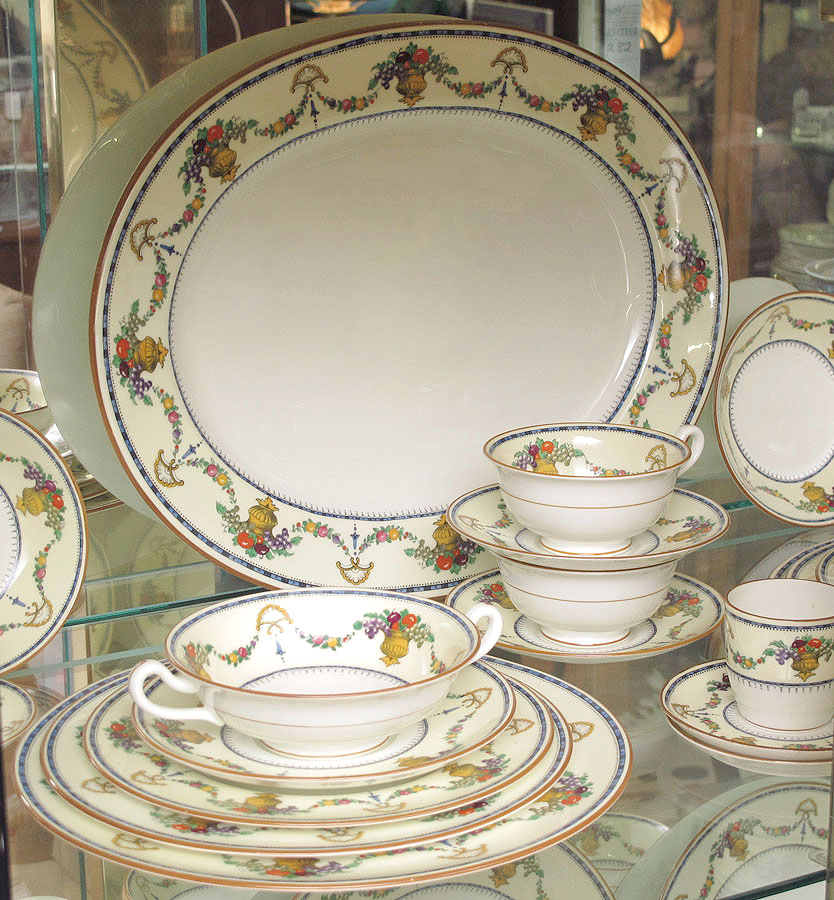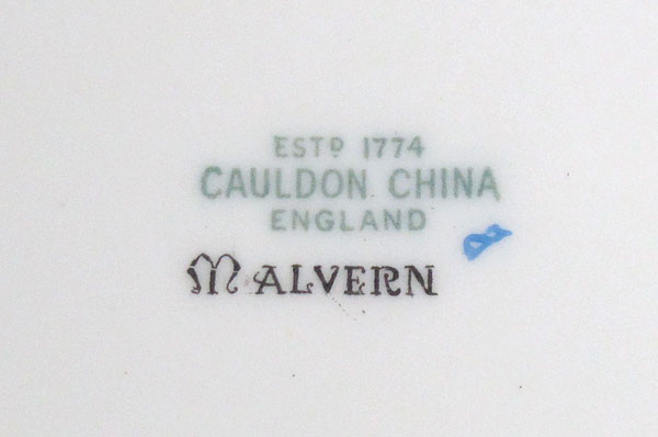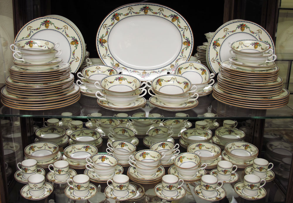 CAULDON ENGLISH FINE CHINA IN THE ''MALVERNE'' PATTERN: Approx. 123 pieces to include the Platter, 12 dinner plates, 12 salad plates, 12 luncheon plates, 12 bread plates, 12 cream soups, 12 saucers, 11 dessert bowls, 11 tea cups, 11 saucers, 10 demi-tasse cups, and 12 demi saucers.