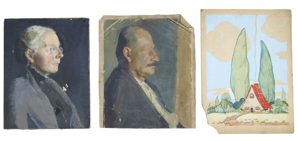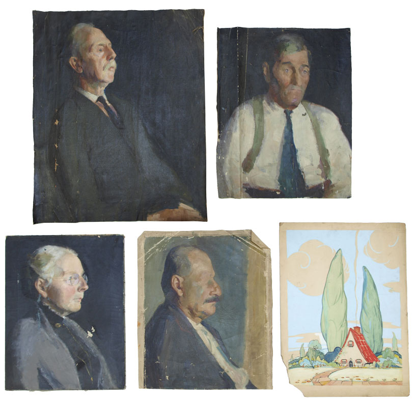 PRESSOIR, Esther Estelle, (American, 1905-1986): 5 pc painting lot to include Portrait of a Man with Mustache, 19 1/2'' x 16'', unstretched, no visible signature, artist's address and name in pencil verso, needs restretching, scattered flecking, folds in canvas, sold as is; Portrait of a White Haired Gentleman with Mustache, Oil/Canvas, 29'' x 24 3/8'', unstretched, no visible signature, ware in left margin, cracklure, needs restretching; Portrait of an Elderly Woman, Oil/Canvas, 2)'' x 16'', unsigned, paint fleck, cracklure; Portrait of a Gentleman in a Tie, Oil/Canvas, 23 1/2'' x 20'', unstretched, no visible signature, marked Pressoir verso, left margin is folded, cracklure throughout, scattered flecking; Gouache Illustration style Cottage Landscape, Image size 20'' x 15 1/2'', marked verso Esther Pressoir, Rhode Island School of Design, missing portion of corner, scattered abrasions and staining, sold as is.