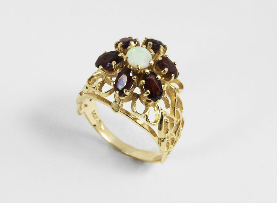14K OPAL AND GARNET RING: 14K yellow gold ring contains 6 oval faceted garnets. Weight: 1.75 Ct. Approx. One 4.00 mm cabochon white opal. Opal and garnets are prong set. Weight: 4.8 grams. Size: 7.5