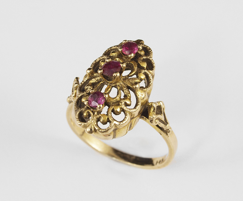 14K RUBY FILIGREE RING: 14K yellow gold ring contains 3 round mixed cut rubies. Weight: .20 Ct. Approx. The rubies are prong set. Weight: 5.0 grams. Size: 7