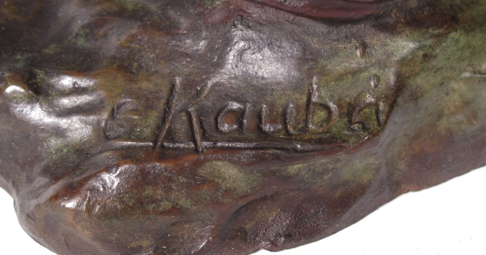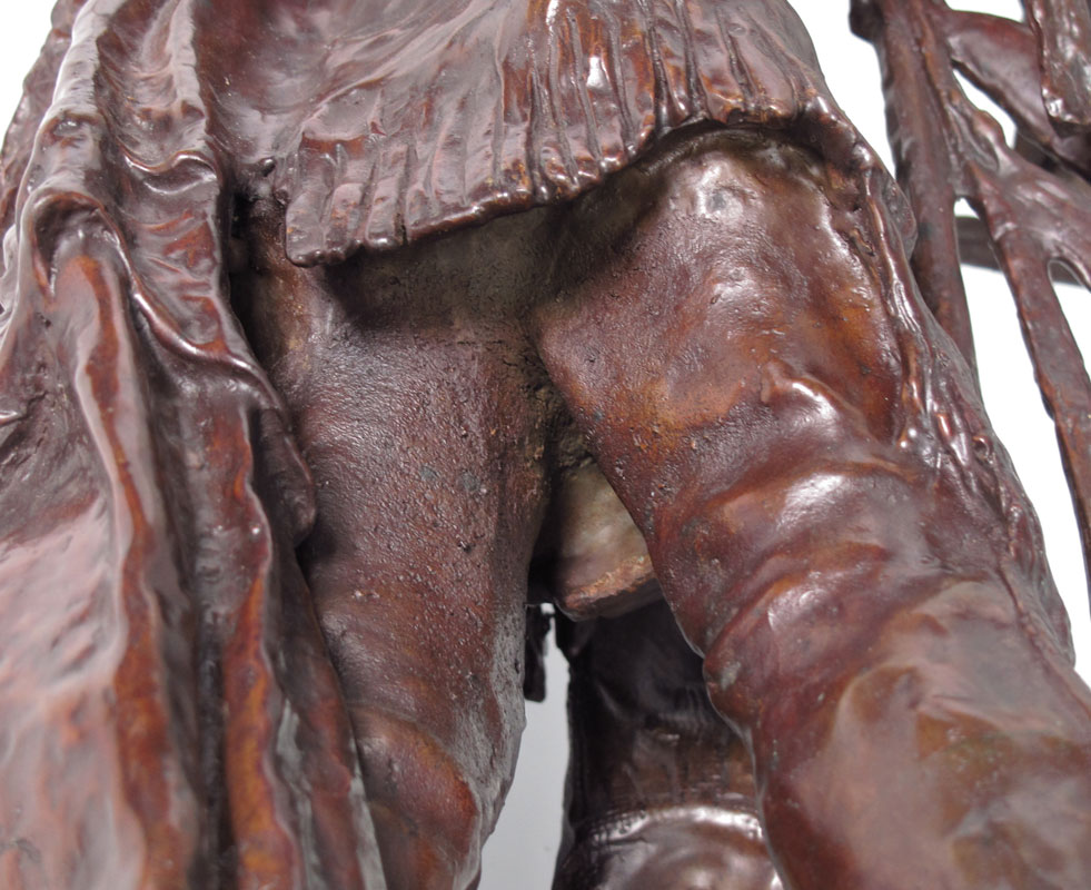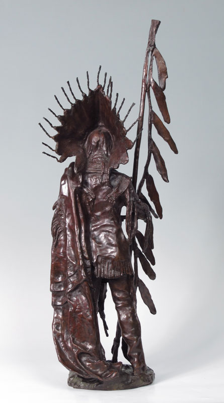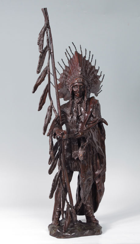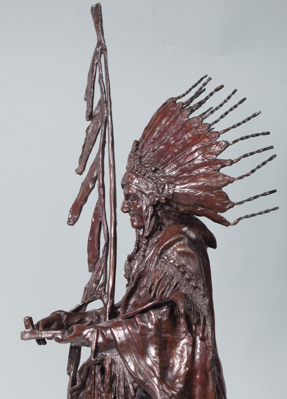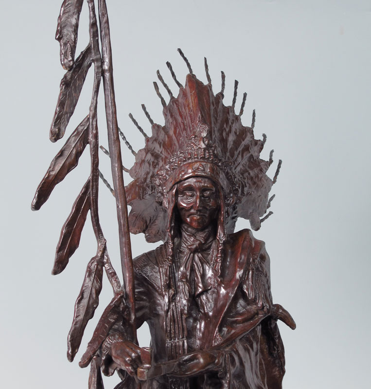 LARGE PATINATED INDIAN CHIEF BRONZE AFTER CARL KAUBA: 30'' h. x 11'' x 10'', incised signature, a fine earlier casting with very good patina.