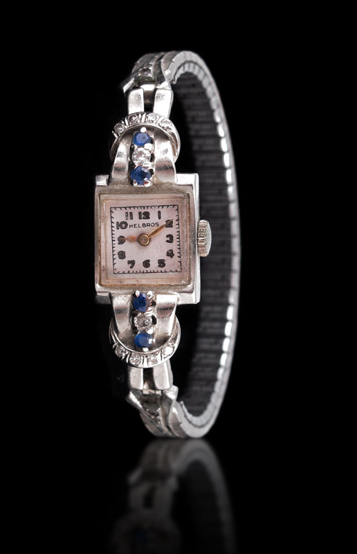 14K LADY'S HELBROS WRISTWATCH: Vintage Ca. 1945-1955. 14K white gold Helbros wristwatch contains 10 round single cut and full cut diamonds. Weight: .20 Ct. approx. 4 round mixed cut sapphires. Weight: .25 Ct. Approx. Mechanical movement is running. Speidel bracelet. Gold weight: 8.0 grams approx.