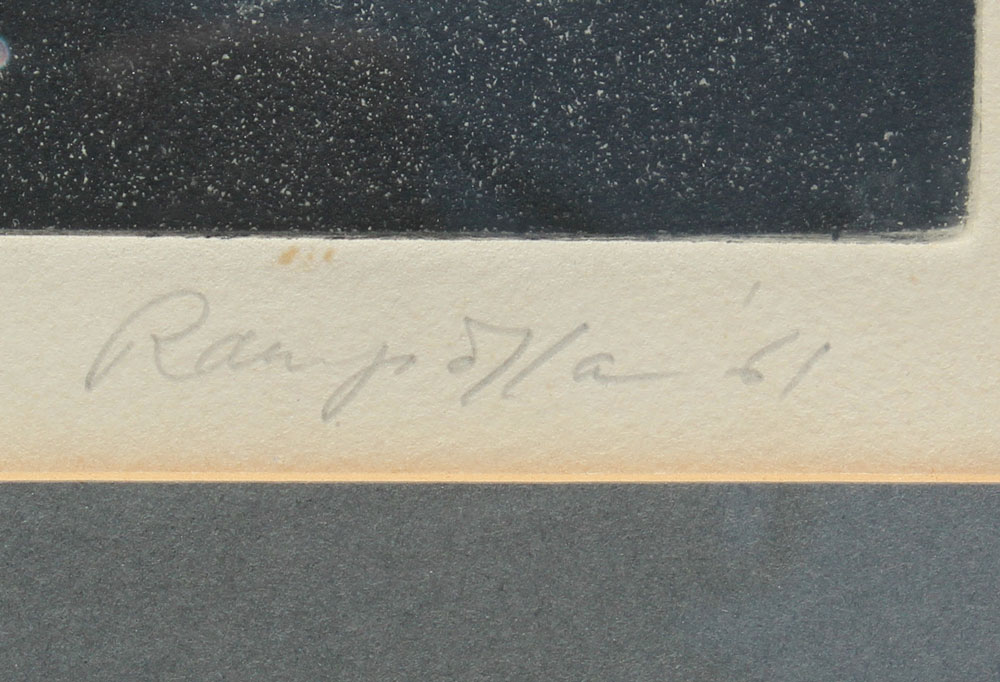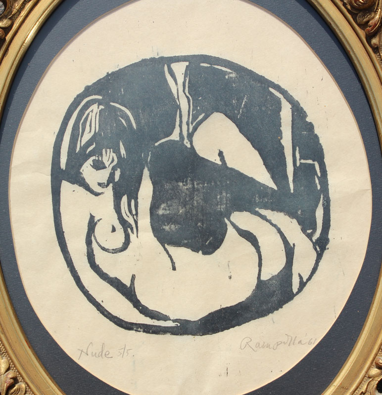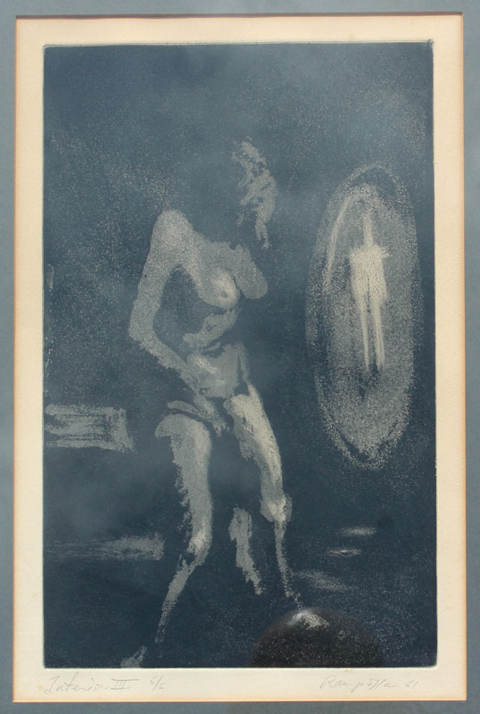 RAMPOLLA, Frank, (American, 1931 - 1971): Two Piece Print Lot to Include; 1) Nude, Woodcut, sight size oval 10 3/4'' x 9 1/2'', pencil signed lower right, dated '61, titled lower left, #'d 5 of 5, pierce carved and gilded oval frame with wear, 17'' x 14''. 2) ''Interior III'', depicts Standing Female Nude, Aquatint, sight size 15 1/4'' x 10 1/4'', pencil signed lower right, dated '61, #'d 5 of 6, carved and gilded frame, 21'' x 15 3/4''. 2) Has some browning from the mat with several faint spots of foxing.