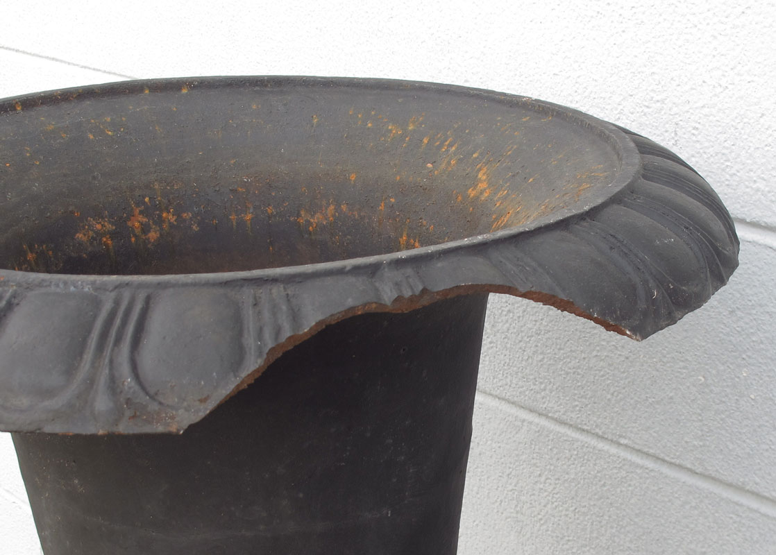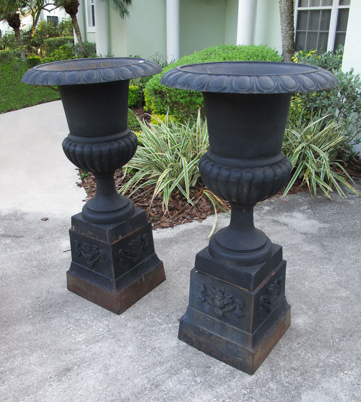 PAIR OF CAST IRON GARDEN URNS: Black painted finish. 44'' h. x 23'' dia.