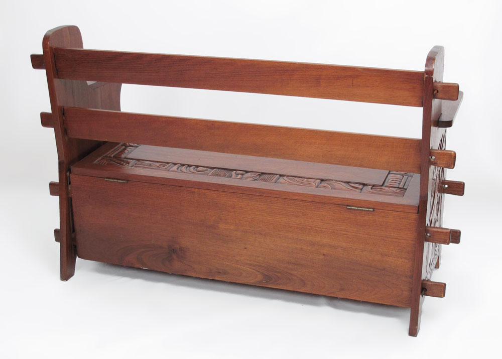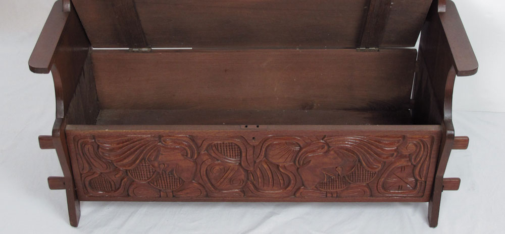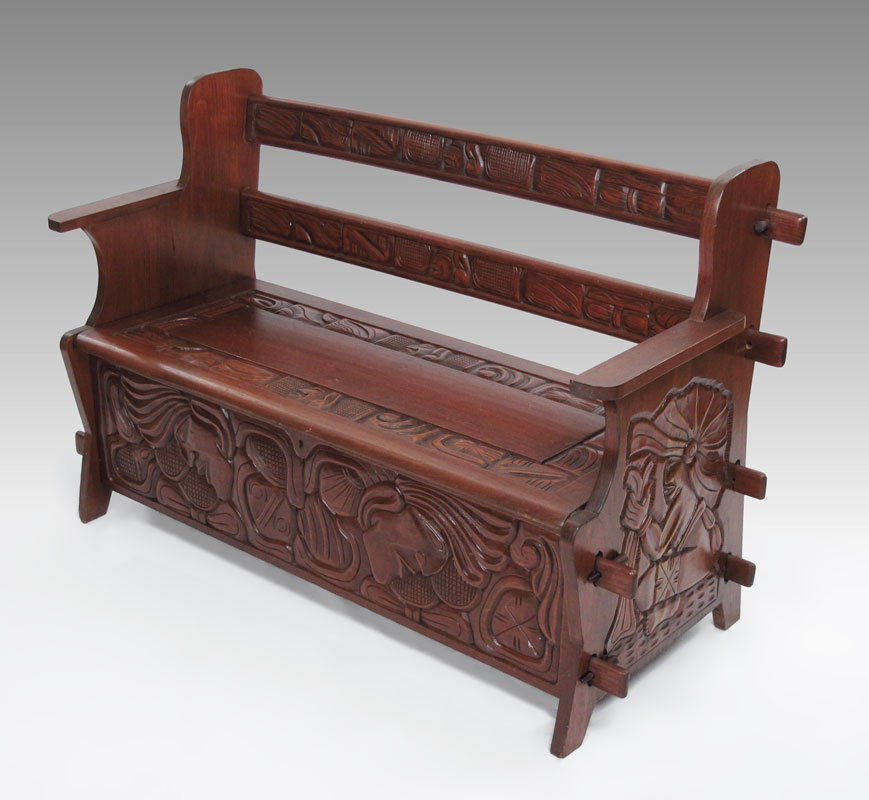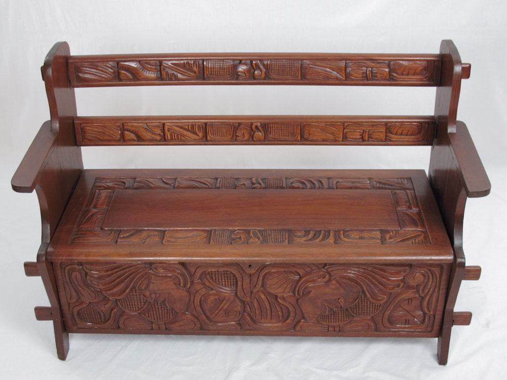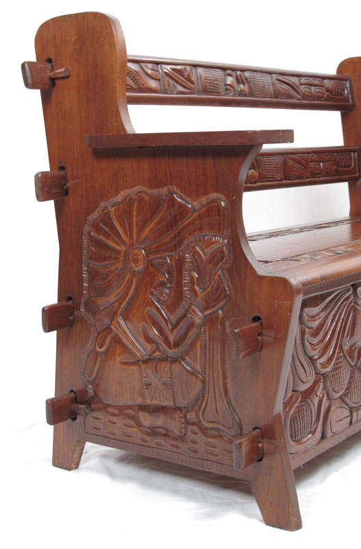 CARVED NARRA WOOD BENCH: Carved with Aztec motifs, 32'' h. x 50'' x 20''