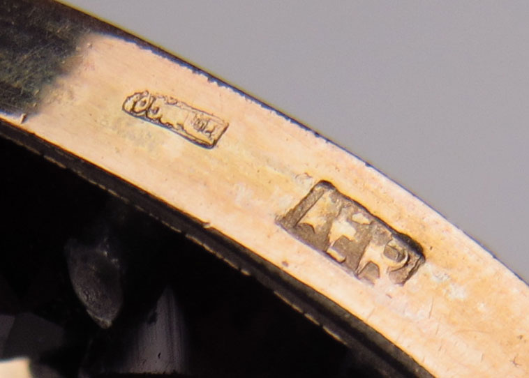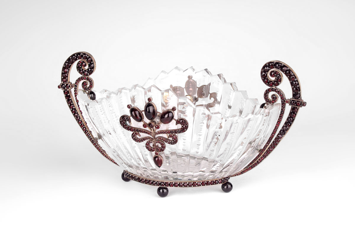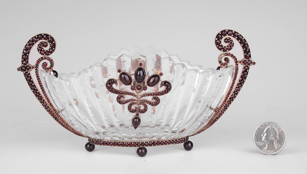 GOLD AND GARNET MOUNTED CRYSTAL BOWL: Zipper cut glass dish with garnets in 10K gold mounts, ball feet. Illegible hallmarks to the gold, assayed at 10K. 3.5''h. x 7''l.