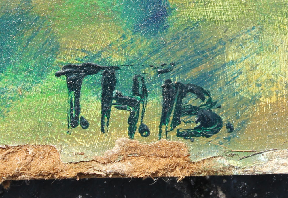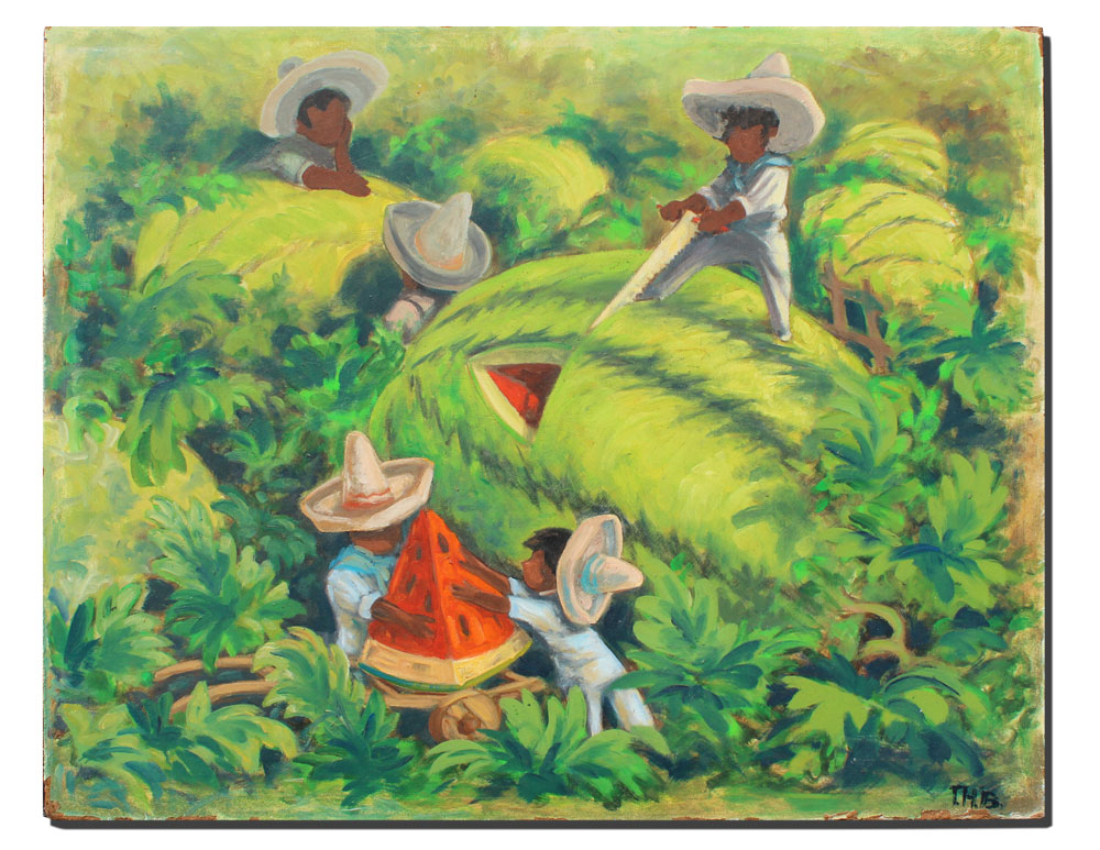 ILLUSTRATIVE OIL ON BOARD OF LITTLE MEXICAN BOYS IN A WATERMELON PATCH WITH OVERSIZED WATERMELONS: Monogrammed lower right THB, 24'' x 30'', unframed, AHDA ARTZT Gallery New York label affixed verso. Some paint loss in the margins.