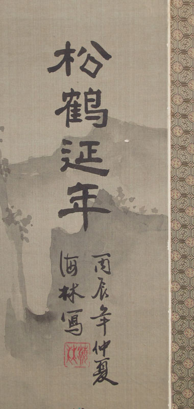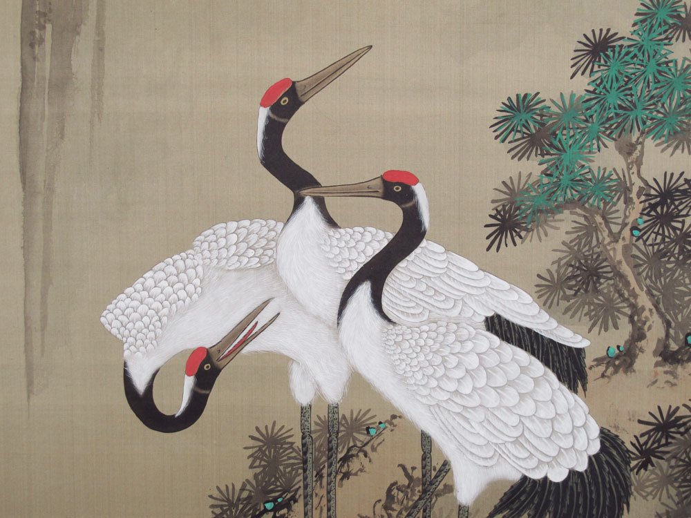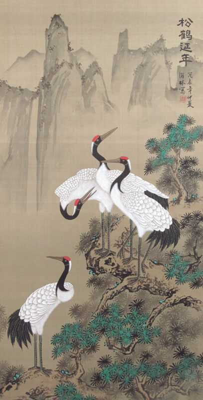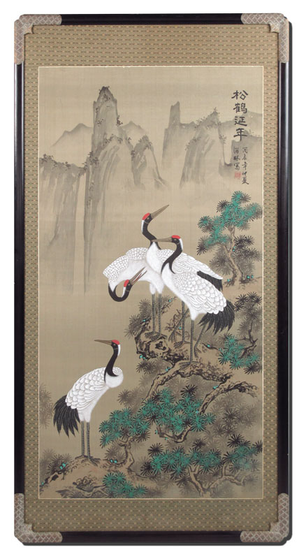 LARGE CHINESE INK AND COLOR ON SILK: 20th C. image of cranes, characters for longevity. Signed and dated. Laid down on board. Framed, 60'' x 32''.