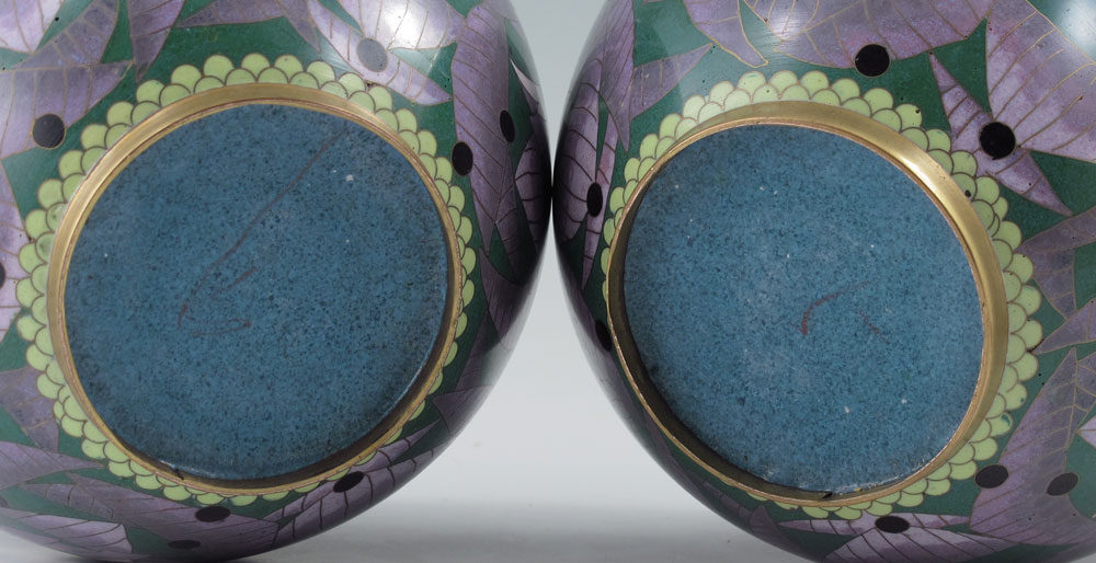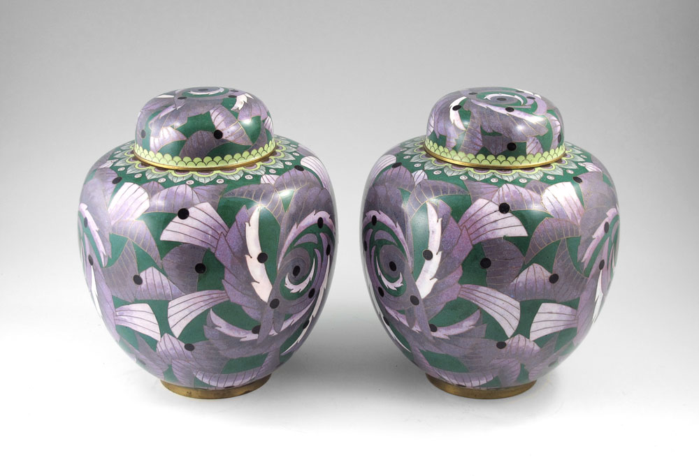 PAIR OF CLOISONNE COVERED JARS: 7 3/4'' h. unusual green and purple coloration