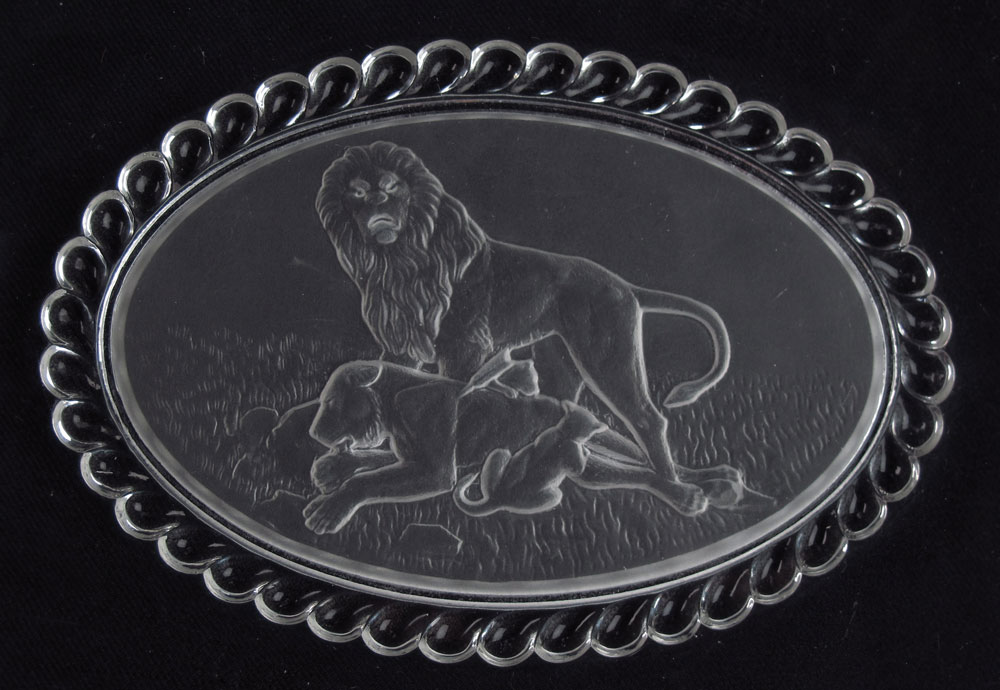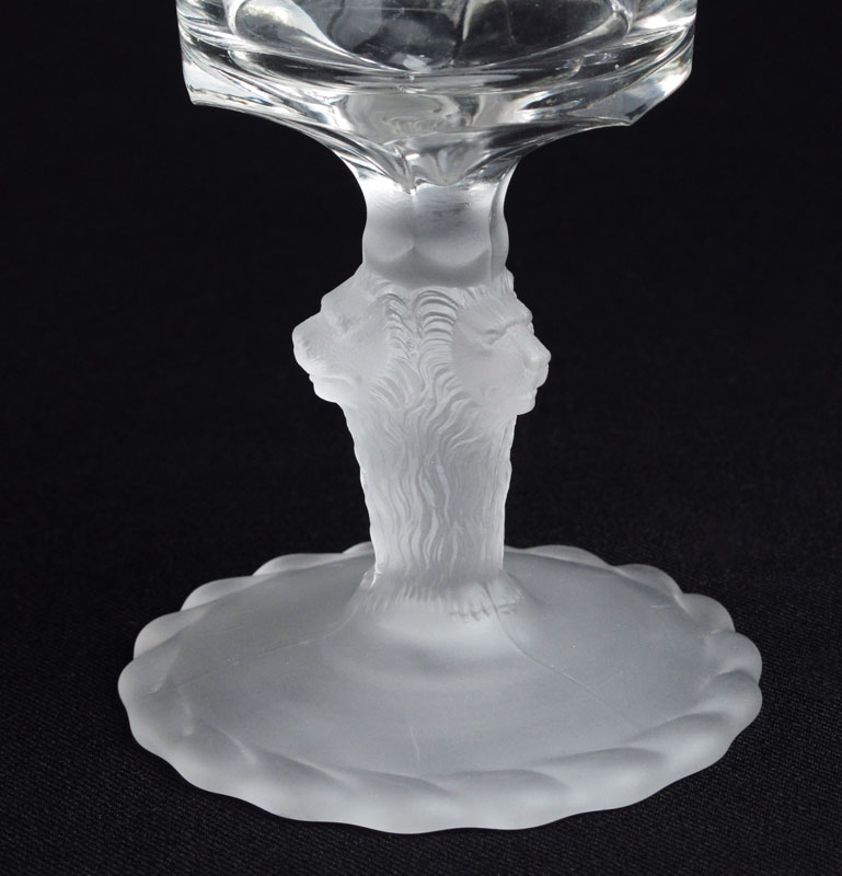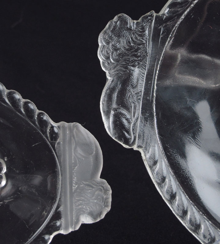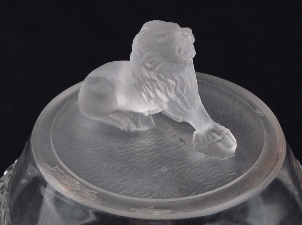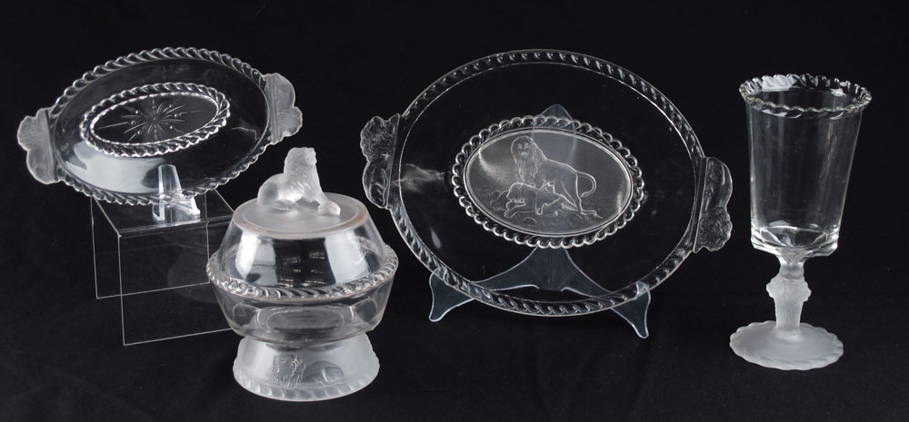 4 PIECE EAPG GILLINDER LION HEAD GLASSWARE: To include 1) Lidded footed bowl with figural lion finial and lion head motif frosted foot. 7 1/2'' h. x 6'' dia. 2) Large glass with frosted lion head stem, 9'' h. 3) Figural clear handled tray with frosted lion and lioness center, 12 1/2'' x 9''. 4) Frosted figural handle tray, 9 5/8'' x 5 3/8''.