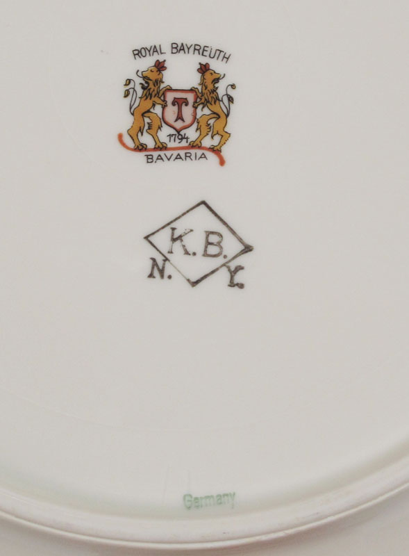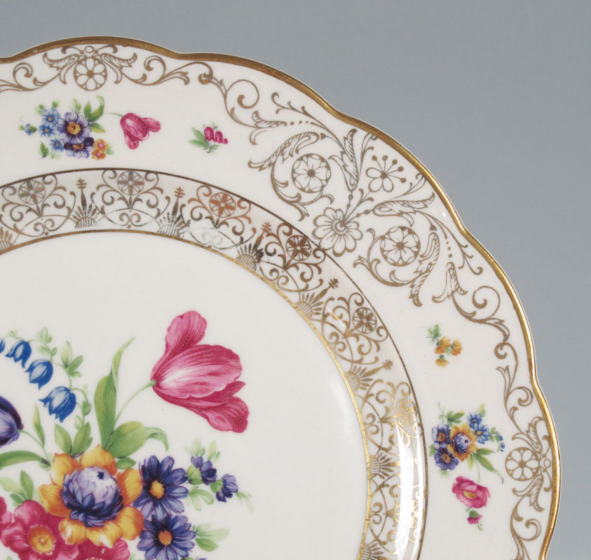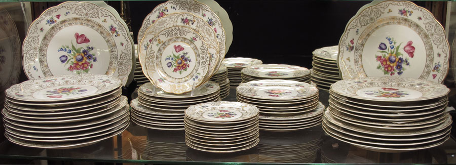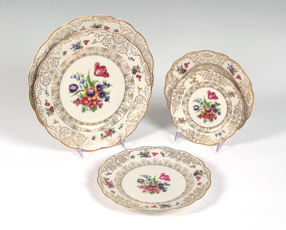 ROYAL BAYREUTH BAVARIAN FINE CHINA PLATES: 60 plates with an ornate scalloped rim, decorated in the Dresden style. 12 each in 5 sizes. Service plates (10 3/4''), dinner plates (10''), luncheon plates (8 3/4''), salad plates (7 3/4''), and bread plates.