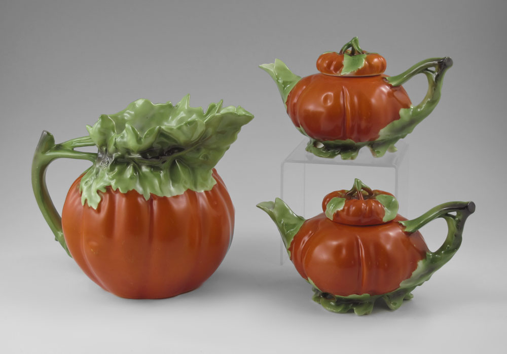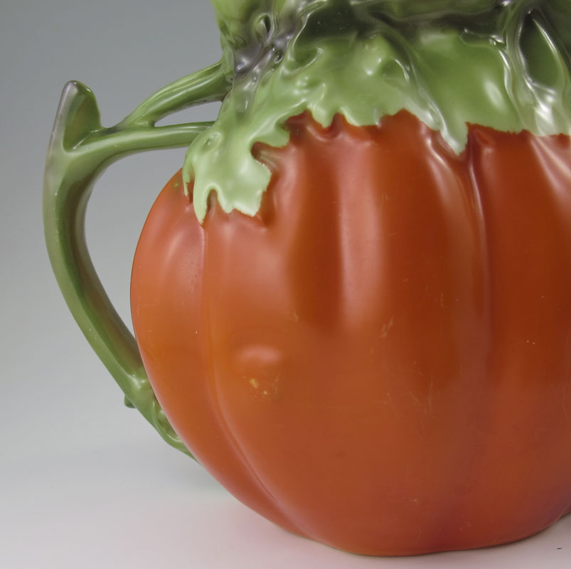 ROYAL BAYREUTH TOMATO PITCHER & TEAPOTS: 3 pieces in the Tomato pattern by Royal Bayreuth to include 1) Pitcher, 6 1/2'' h. x 8 3/4''. 2) Pair of covered teapots, 4 1/4'' h. x 7 1/2''.
