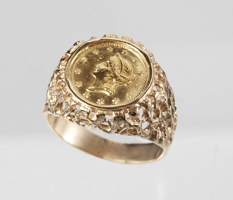 1851 US ONE DOLLAR GOLD COIN RING: 1851 US 1 dollar gold coin set in 14k gold ring mount. size 9 1/2. Approx. 7.3 grams total weight.
