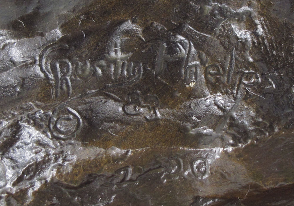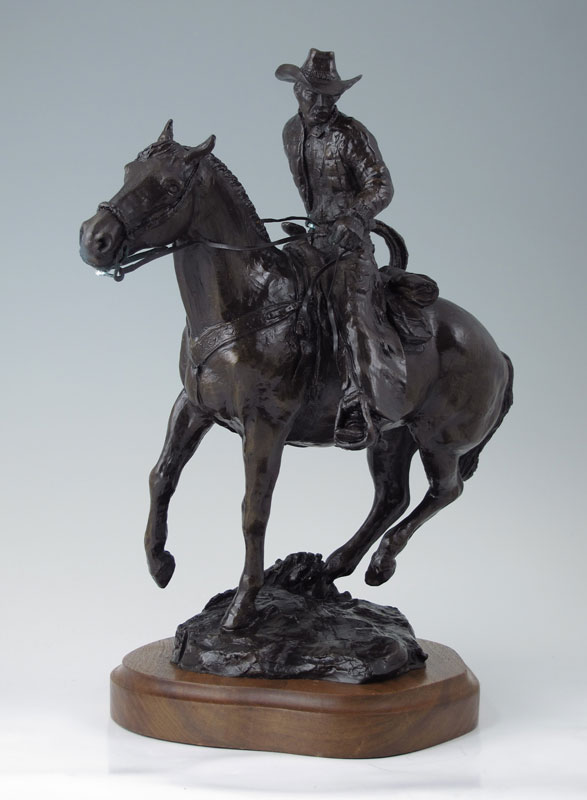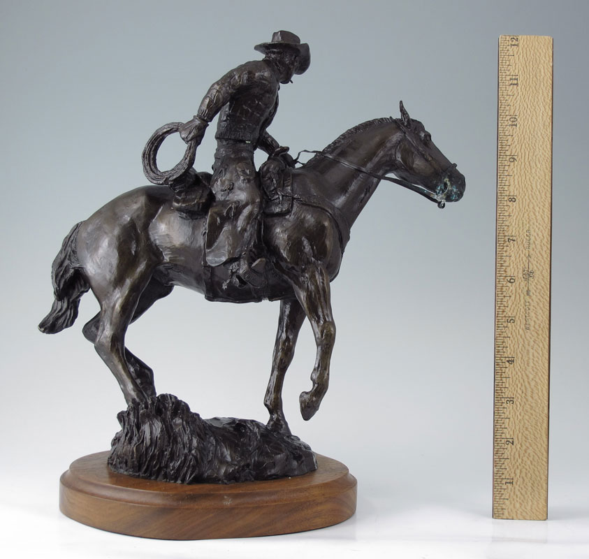 PHELPS, Rusty, (American, 20th C.): Cowboy on Horseback, Bronze, 11 1/2'' h., 12'' w., affixed to beveled wooden plinth 1'' h., incised signature, dated '83, numbered 2/20.