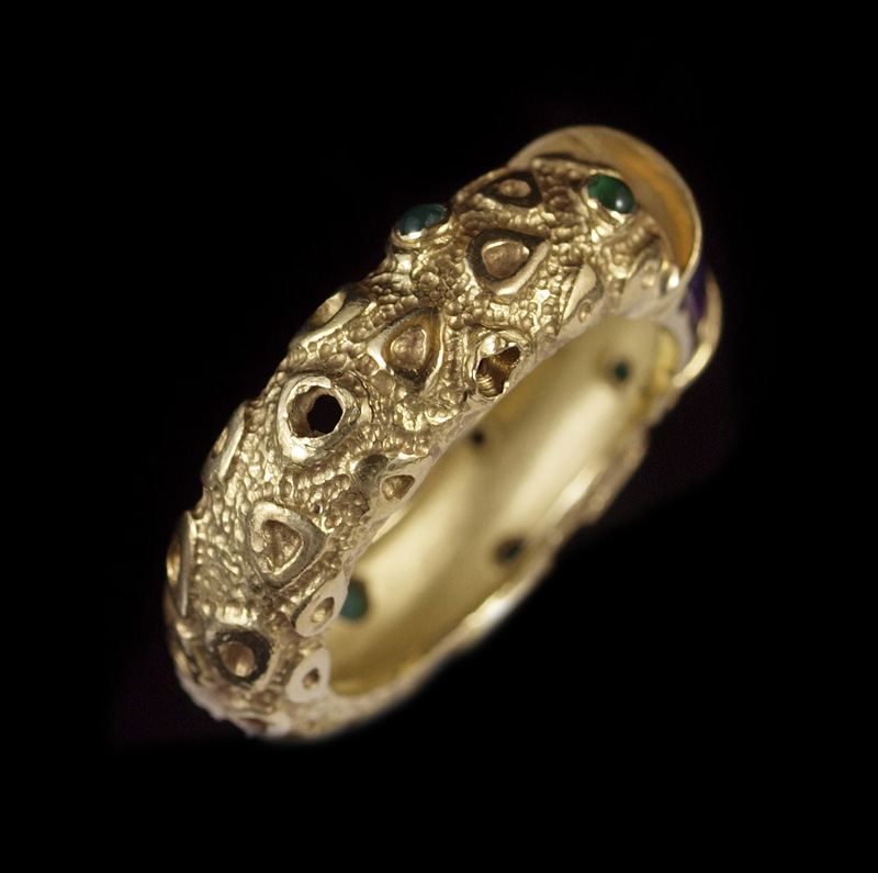 18K AMETHYST & EMERALD RING: 18K yellow gold ring contains three emerald cut amethysts. Weight: 1.00 Ct. Approx. 6 Round cabochon cut emeralds. Weight: .15 Ct. approx. The amethysts are channel set. The emeralds are bezel set. Weight: 8.2 grams. Size: 6